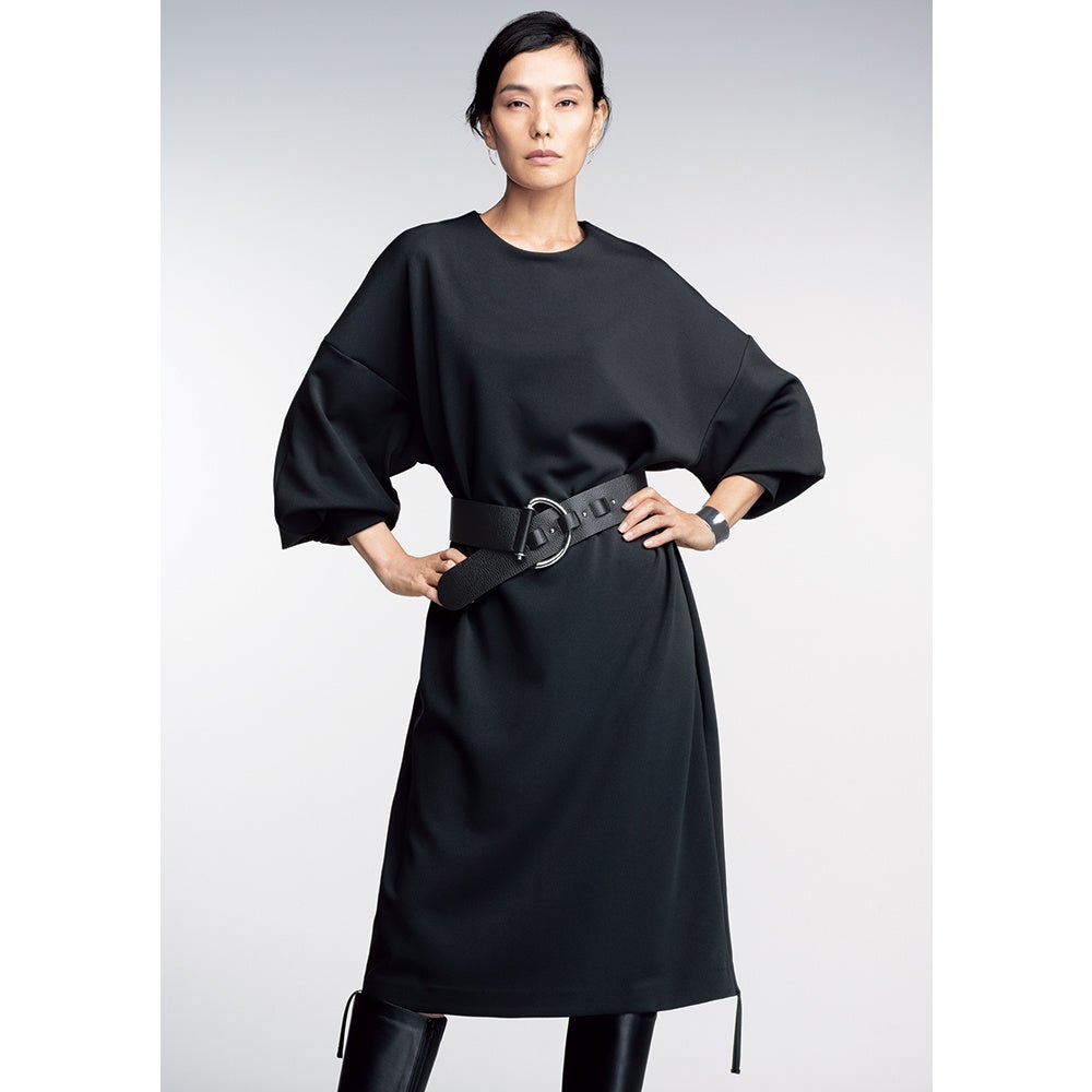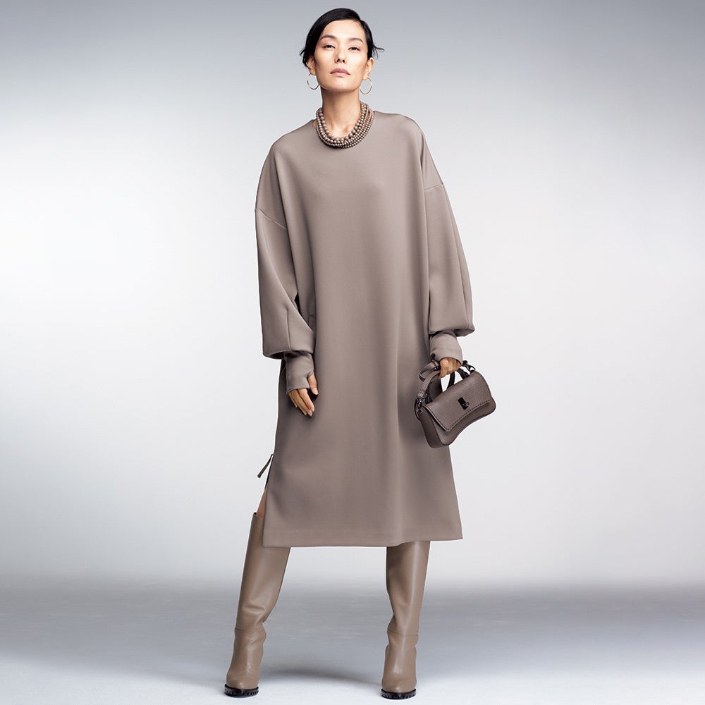 「作りたいものを考えた時に真っ先に思い浮かんだのが、長時間着てもシワになりにくく、カジュアルにもエレガントにも着られるワンピース」とSAWAさん。軽やかなダンボールジャージー素材をセレクトし、少し鎖骨がのぞく拘りの襟開きとドロップショルダーのコクーンシルエットが上品なモード感を醸すデザインに仕上げました。開け方で好みのニュアンスを演出できる飾りテープ付きファスナースリット、たくし上げればパフスリーブ風、フィンガーホールに親指を通せばアームウォーマー風にアレンジできる幅広のカフス…と遊び心が光るディテールも必見です。「一枚で着るだけでなく、アクティブに過ごす日は、チュニック風にパンツを合わせる着こなしもおすすめです」とのコメントが、しなやかなリアルクローズ観を感じさせます。
