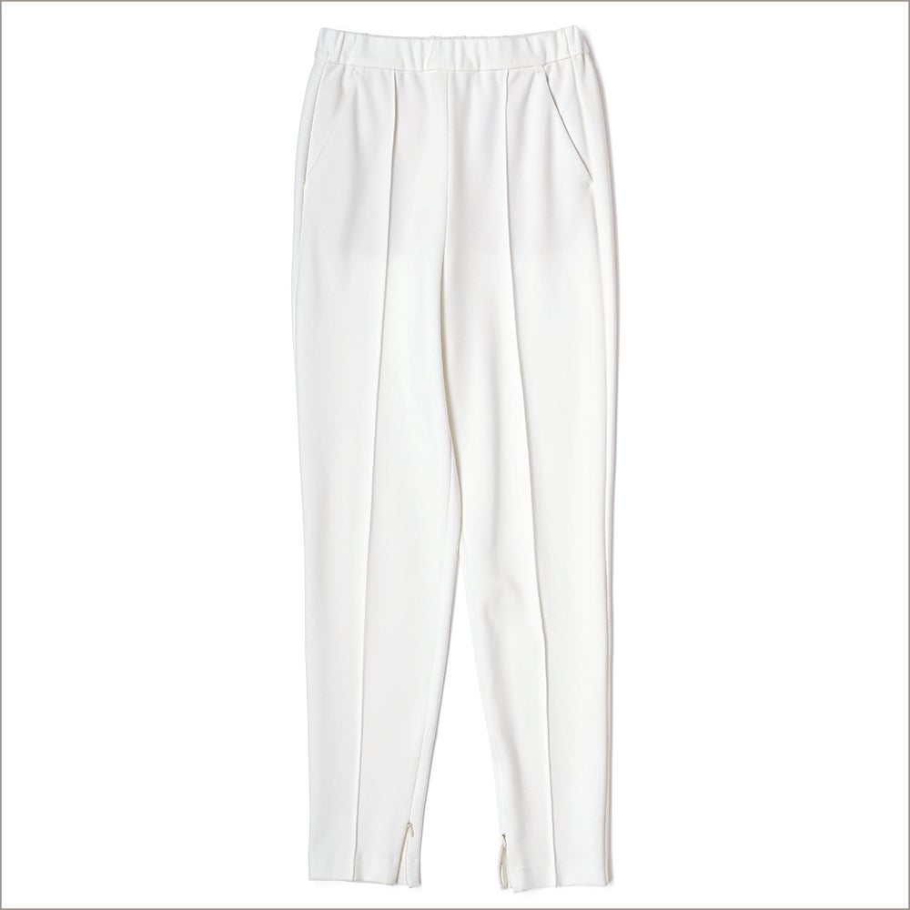 白とネイビー2色をセレクトしたパンツは、リッチな風合いと暖かな肌触りを備えた裏起毛ジャージー素材。ウエスト周りやわたり部分に程良くゆとりを持たせたテーパードラインで、前中央のピンタックがきちんと感と美脚効果を後押しします。裾内側にはファスナースリットを設け、ブーツインでももたつかない筒幅と脱ぎ着のしやすさにも拘りました。SHIHOさん曰く、「目指したのは、ホテルにもはいていけるリラックスパンツ(笑)。素材選びにも試作チェックにも時間をかけた自信作」です。