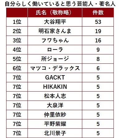 「自分らしく働いていると思う芸能人・著名人」を聞いたところ(有効回答591)、1位「大谷翔平」、2位「明石家さんま」、3位「フワちゃん」という結果になりました。