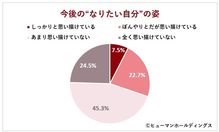 「今後の“なりたい自分”の姿を思い描けているか」という質問に対し、思い描けているのは3割で、「あまり思え描けていない(45.3%)」、「まったく思い描けていない(24.5%)」という結果になり、69.8%は“なりたい自分”の姿を思い描けていない状況が伺えます。