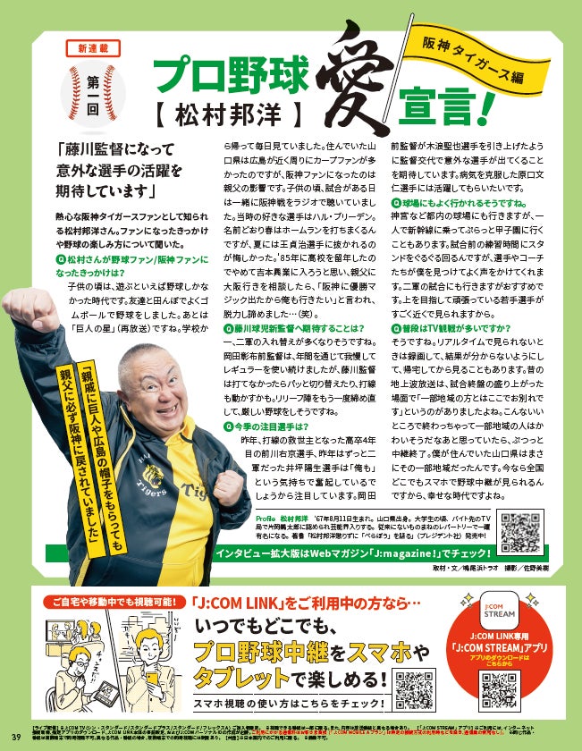 新連載「プロ野球“愛”宣言」は、J:COMのご加入者さま向けガイド誌「ジェイコム マガジン」及び“エンタメをもっと楽しむWebマガジン”「J:magazine!」(読み:ジェイマガジン)で毎月掲載し、日本全国のプロ野球ファンにお届けします。連載に登場する著名人が、球団のファンになったきっかけや注目選手、さらに球場、TV、タブレットやスマホでの観戦など、ご自身の“リアル”な「プロ野球の応援&観戦スタイル」を語ります。第1回は「有望なアマチュア野球選手を阪神に勧誘すること」を趣味とする、熱列な阪神タイガースファン松村邦洋さんの「阪神愛」をお楽しみいただけます。