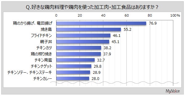 好きな鶏肉料理や加工食品は(複数回答)、「鶏のから揚げ、竜田揚げ」が76.9%、「焼き鳥」が55.2%、「フライドチキン」「親子丼」が45~46%です。