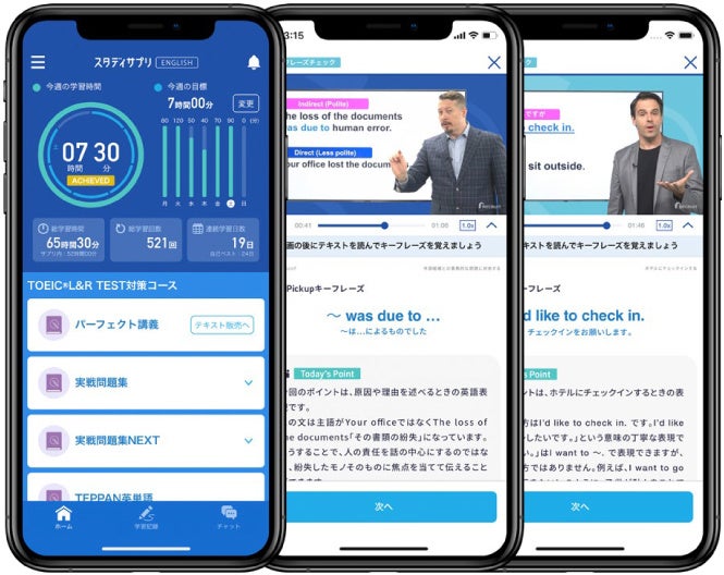 1回3分からの隙間時間で英語学習ができるアプリ。大人の英語学習では新日常英会話コース / TOEIC® L&R TEST対策コース / ビジネス英語コースがあり、TOEIC® L&R TEST対策コースでは業界初、オンライン完結型コーチングを実現したパーソナルコーチプランも提供しています。2021年には、新日常英会話コース、ビジネス英語コースにオンライン英会話がセットになったプランも登場。