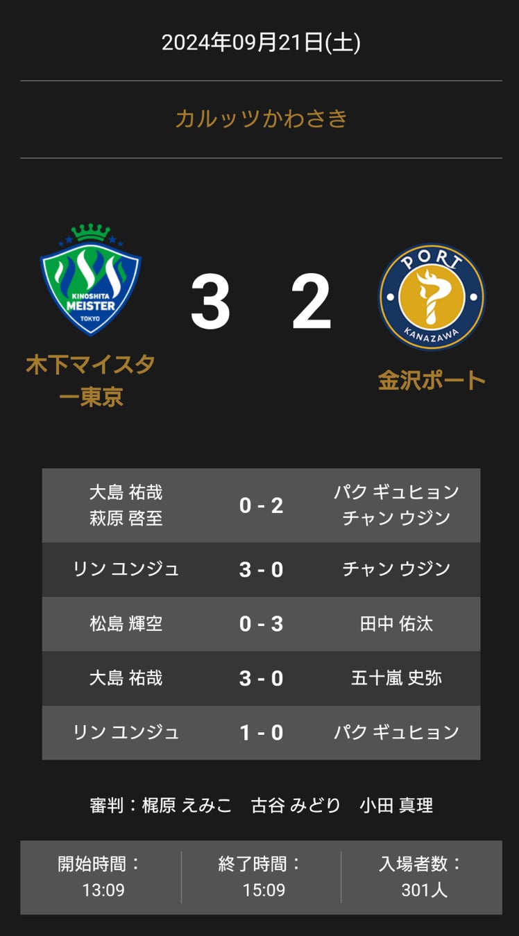 木下マイスター東京と金沢ポートの試合は、3-2で木下マイスター東京が勝利しました。