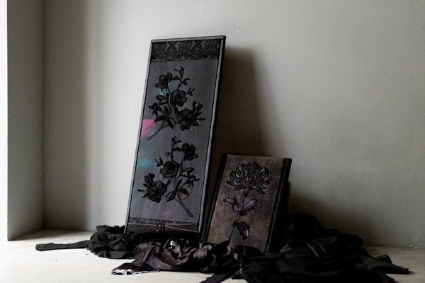 桐塑または木で作られた人形に、衣服の皺や模様の形に本体に筋彫りを入れ、筋彫りに目打ちなどで布の端を押し込んで衣装を着ているように仕立てた人形(木目込人形)の技法からヒントを得て、独特の手法で生み出した新しいアートワーク。ノリなどの接着剤等を使わず1ピース1ピースを少しずつ丁寧に埋めていきます。また、作品には廃材の発泡スチロール、古着の生地、服を作る過程で出るサンプル用の生地などを主に使用しています。