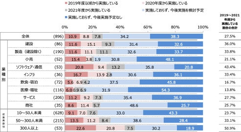 19~21年度における企業の業務デジタル化・自動化の実施率は27.5%となった。業種別では、[ソフトウェア・通信]が最も高く43.4%、業務のデジタル化は少子高齢化に伴う人手不足の解決策となり得るが、取り組んでいる企業は半数以下という結果だった。【図6】