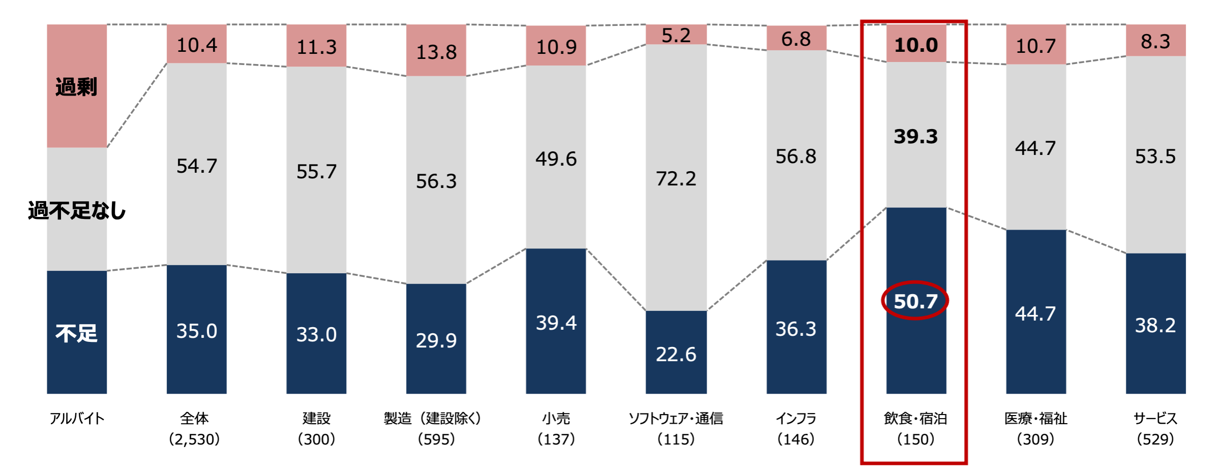 [飲食・宿泊]業でアルバイトが「不足している」割合は50.7%。21年10月に緊急事態宣言が解除されてから、依然約5割の企業が人手不足を感じている。
