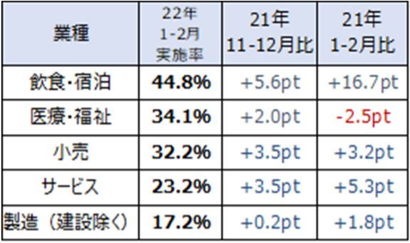 採用活動の実施率も[飲食・宿泊]が44.8%と最も高く、21年11-12月より5.6pt増加、前年同期の21年1-2月より16.7pt増加した。3月は大学生・院生の進級や卒業による離職もあり、特に学生アルバイトの割合が高い飲食・宿泊業は、4月以降を見越して採用活動を行う企業が増加したと考えられる。【図1、2、3】