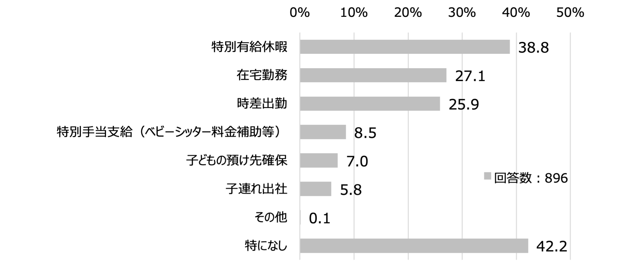 新型コロナウイルスの影響で保育園や学校が休園・休校になった場合に、企業が非正規雇用者に対して設けている制度をみると、「特別有給休暇」が38.8%と最も高く、次いで「在宅勤務」が27.1%となった。【図4】