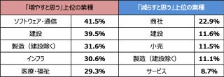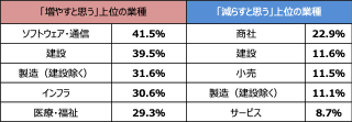 また、今後デジタル化が進むことでの採用数の変化について聞いたところ、全体の採用数では「増やす」が29.8%、「減らす」が10.0%となり、「増やす」を業種別でみると[ソフトウェア・通信]が41.5%と最も高く、次いで[建築]が39.5%となった。【図7、8】