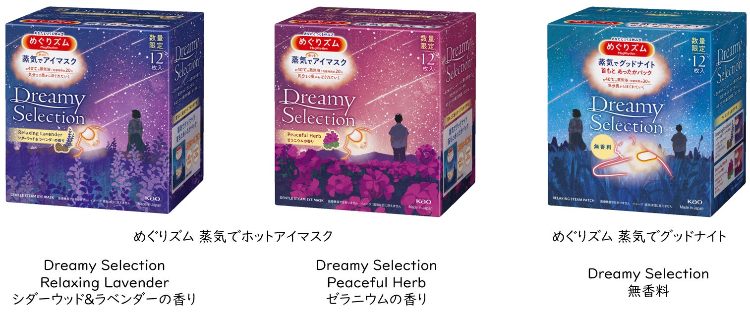 花王株式会社の「めぐりズム」は、2024年11月9日に「めぐりズム Dreamy Selection」として、「蒸気でホットアイマスク」2種の香りと、「蒸気でグッドナイト」無香料を数量限定で発売します。