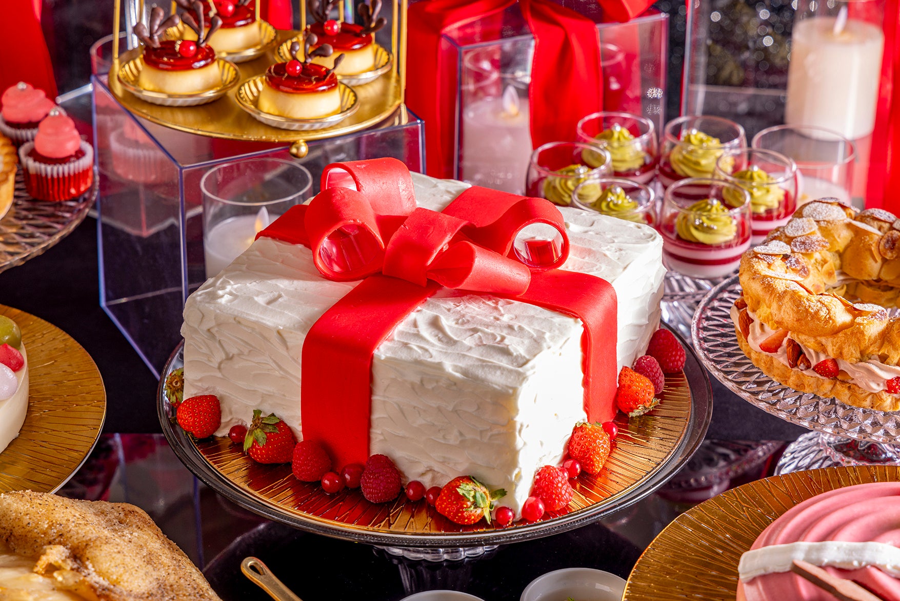 プレゼントボックス/ベリーのタルトフロマージュ/パリブレスト/リースショコラ/サンタクロースのケーキ/トナカイのプリン/クリスマスストライプ/ベルベットのカップケーキ