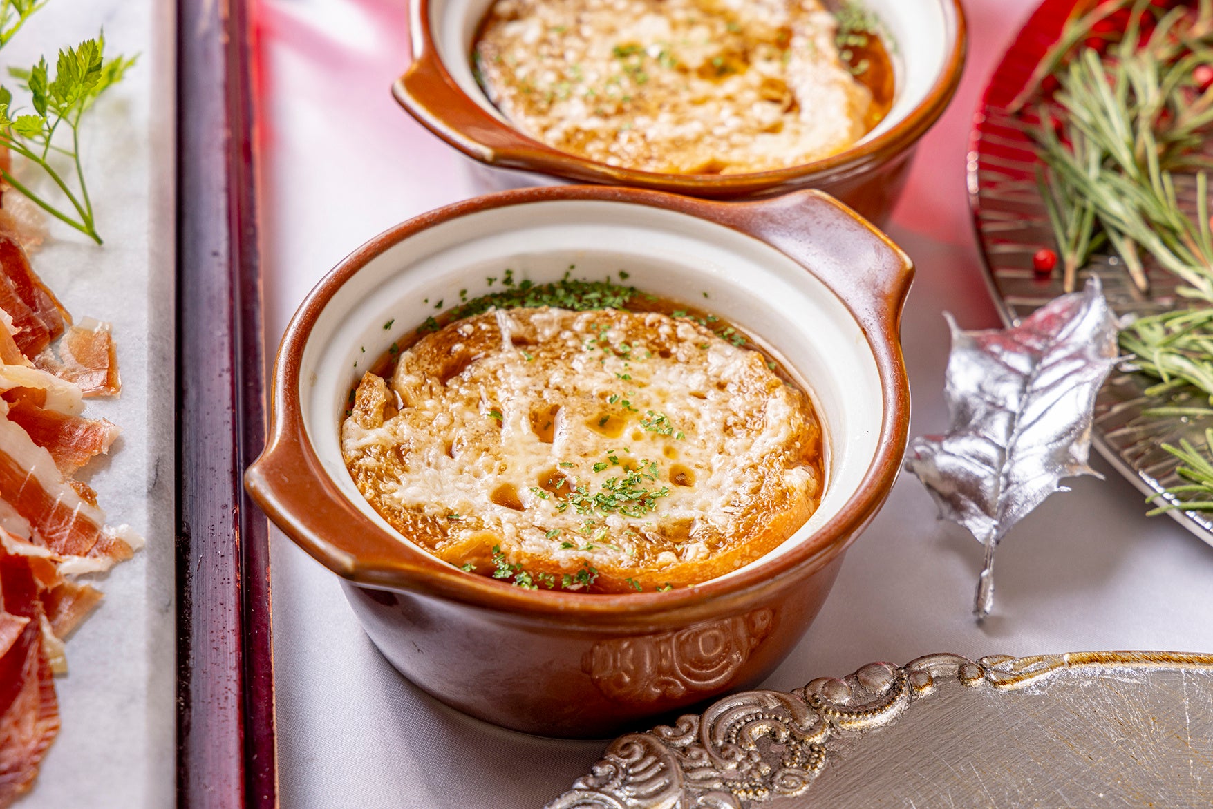 フレッシュトマトのムースとモッツァレラ、バジルのクリスマスカプレーゼ/なめらかなオニオンフランとホタテ、貝のエマルジョンソース/赤ピーマンのクレームブリュレ仕立て/シャリキュトリーバリエ/ホールチーズのスペシャルシーザーサラダ(ランチ・ブランチ) ほか