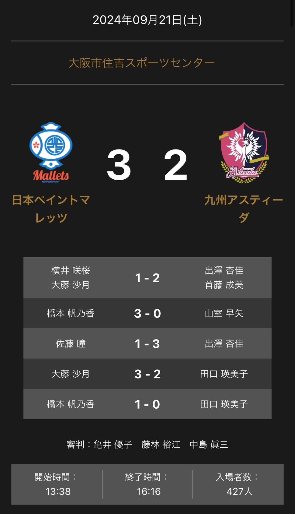 ノジマTリーグ 2024-2025 公式戦 9月21日開催 日本ペイントマレッツvs九州アスティーダ 試合結果一般社団法人Tリーグ2024年9月21日 16時26分いいね!数を読み込み中です 日本ペイントマレッツと九州アスティーダの試合は、3-2で日本ペイントマレッツが勝利しました。すべての画像種類イベントビジネスカテゴリスポーツキーワードTリーグノジマTリーグ日本ペイントマレッツ九州アスティーダ関連リンクhttps://tleague.jp/schedule/detail.php?id=758ダウンロードプレスリリース素材このプレスリリース内で使われている画像ファイルがダウンロードできます