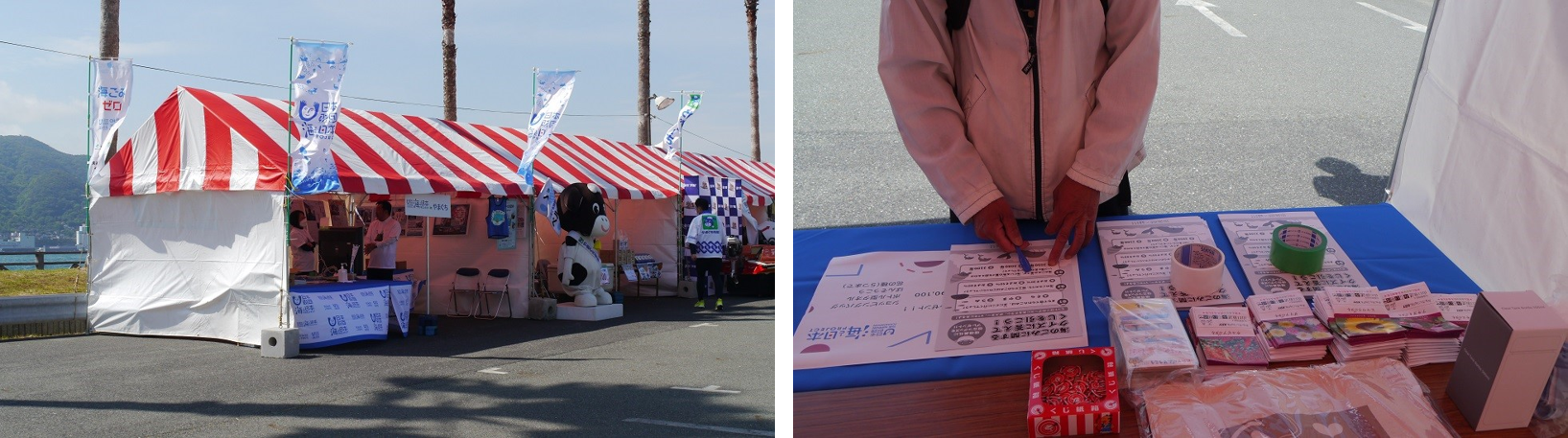 海からすぐの会場にふさわしく、ブースでは海洋ごみに関するPRコーナーを設け、誰でも参加できる海洋ごみクイズを実施しました。3問のクイズに回答するとスピードくじにチャレンジできる仕様にしました。クイズに挑戦した子どもたちの多くが、悩みながらもクイズ用紙の裏側に書かれている「海と日本プロジェクト」の主旨説明文や、ブースに貼られているポスター、ブースで流れているスポGOMIアニメなどのヒントを元に見事に正解を当てていました。間違えた子どもたちにはスタッフが正解を教えて丁寧に解説。結果として、スピードくじの景品も途中でなくなってしまう程、沢山の方にクイズに参加していただき、海をキレイにするグッズを持って帰っていただきました。