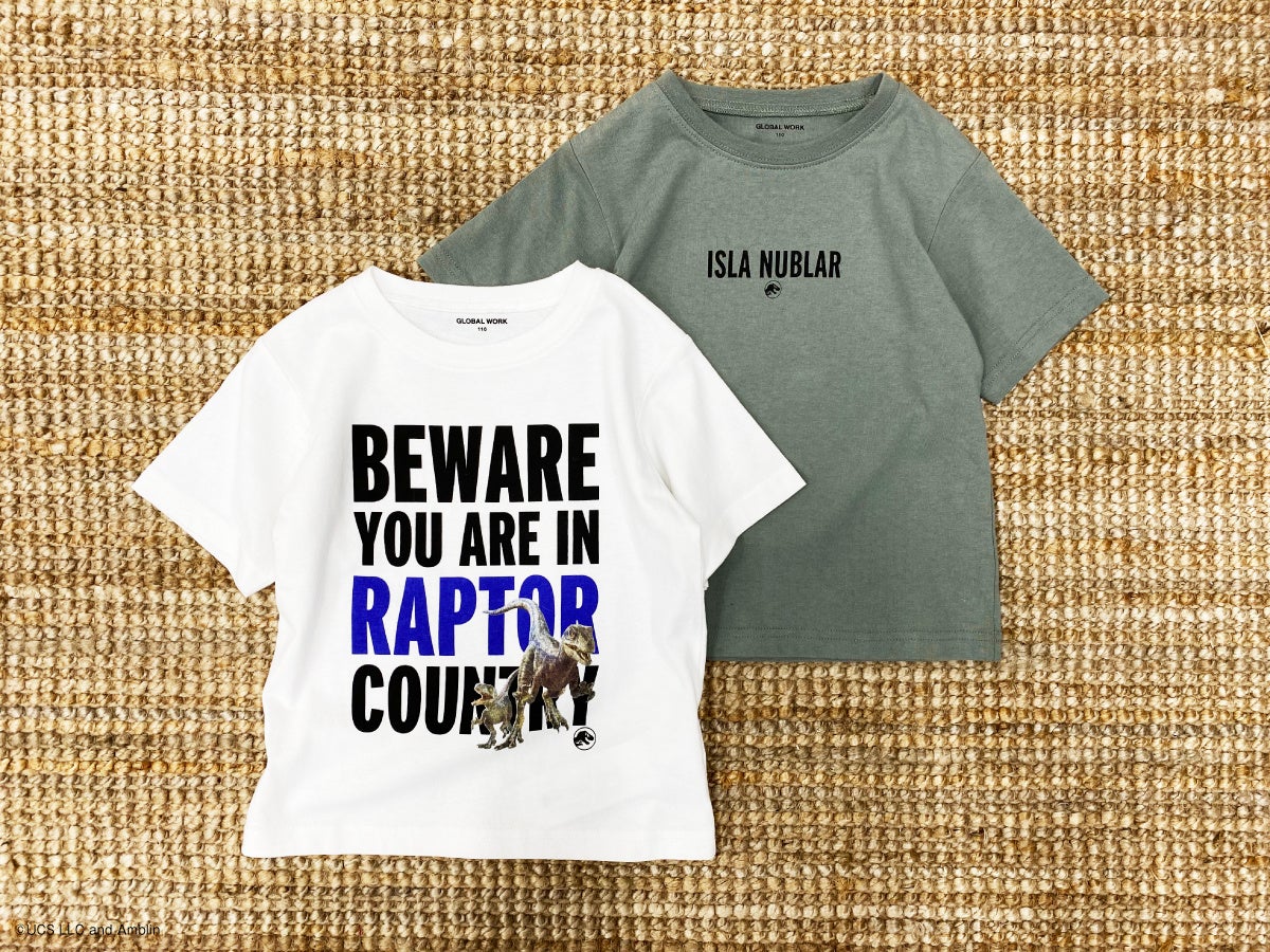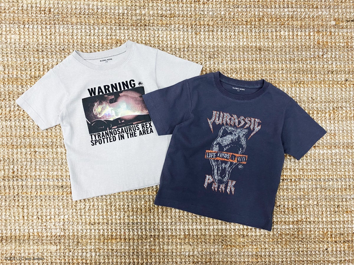 グローバルワークのキッズでは「学校イチ!おしゃれ」をテーマにアパレル・服飾雑貨を展開し、その中でも恐竜をテーマにデザインしたTシャツを毎シーズン展開しており、親御さまからの支持はもちろんのこと、子どもたちも喜ぶ大人気の商品です。今シーズンは、『ジュラシック・パーク』シリーズの映画の作中に登場するT-レックスやヴェロキラプトルなど、子どもたちに大人気の恐竜でデザイン。グローバルワークのキッズらしい大人顔負けのクールなカラーリングや、エッジの利いたグラフィックでデザインした全6柄をラインアップしました。