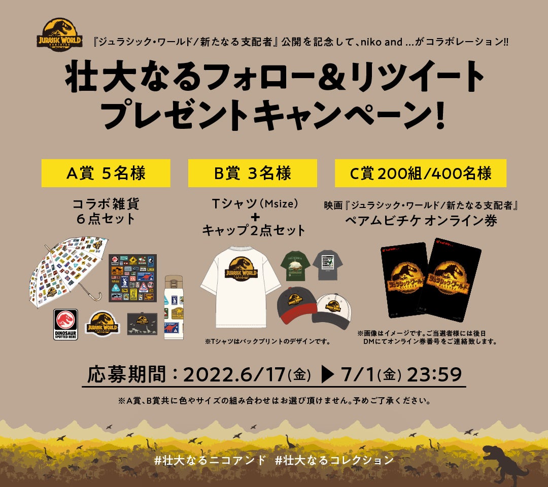 最新作『ジュラシック・ワールド/新たなる支配者』の7月29日(金)公開に先駆け、GLOBAL WORK から6月1日(水)にキッズTシャツが、niko and ...(ニコアンド)からは6月17日(金)にコラボアイテムを公式WEBストア .st(ドットエスティ)と全国の各店舗にて発売いたします。さらに、niko and ...(ニコアンド)では同日より公式twitterにて、「壮大なるフォロー&リツイートプレゼントキャンペーン」を実施いたします。