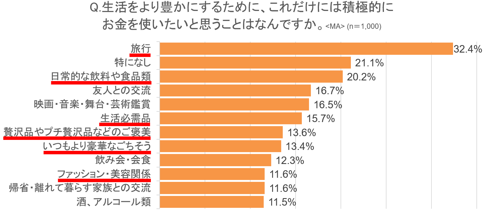 Amazonは2022年11月、全国の20歳から69歳の男女1,000人を対象に「行動制限と生活に関する意識調査」を行いました。コロナ禍に次ぐ物価高騰によって日常生活にさまざまな制約が生じている今、生活を豊かにするために積極的にお金を使いたいことについて聞いたところ、「旅行」「贅沢品やプチ贅沢品」「豪華なごちそう」「ファッション・美容」など、自分へのご褒美となるカテゴリーが挙がる一方で、「日常的な飲料や食品類」「生活必需品」など日々の生活に欠かせない日用品も多く回答に挙がりました。