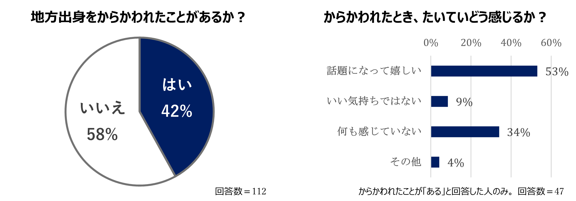調査の結果より、地方出身者でからかわれたことのある人のうち、53%が「話題になって嬉しい」と回答。からかった経験のある首都圏出身者に、からかった理由を尋ねたところ86%が「話が盛り上がるきっかけ」と答えました。コミュニケーションの一環として地方いじりが受け入れられていることがうかがえます。他方で、からかわれたことがある人のうち、9%が「いい気持ちではない」と回答していました。専門家からはこの認識のギャップについて、「いじめの構造に似ている」という指摘が出ています。