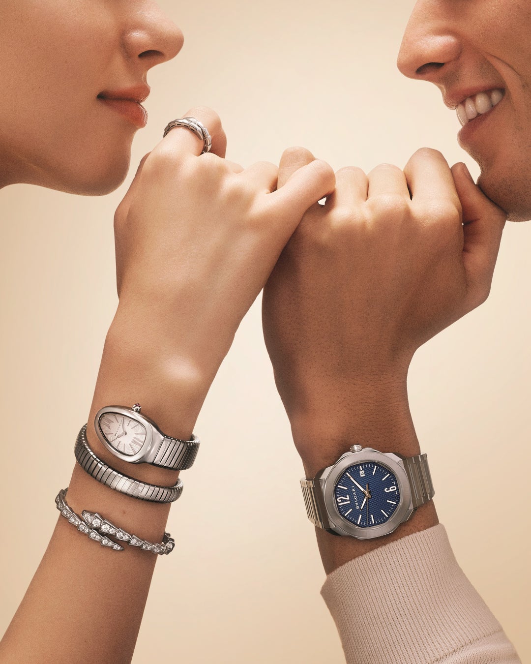 タイムレスそしてアイコニックなブルガリのメンズ&レディースウォッチは、不変の愛の力が宿ります。「セルペンティ トゥボガス」は、メゾンを象徴する2つのシグネチャーを融合させたモデルです。しなやかなブレスレットは、美しい曲線を描くトゥボガスのスパイラルが手首を流れるように包み込み、特徴的なカーブを描くケースは、神話に登場する蛇の頭を連想させます。「オクト ローマ」は、イタリアンデザインとスイスのウォッチメイキングのクラフツマンシップを融合させ、永遠なるローマの美とモダニティにインスパイアされた、丸みを帯びた八角形のケースに収められています。