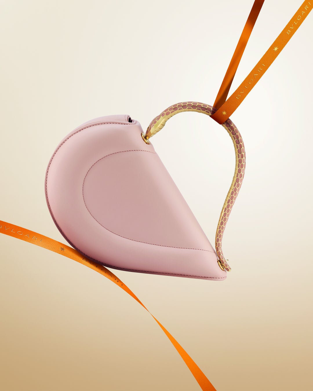 究極の愛のシンボルであるハートのフォルムをした新作バッグ「セルペンティ クオーレ 1968」は、ブルガリとその大切なシンボルとの強い絆を祝福します。心が求めるものの象徴であるこのバッグは、滑らかなカーフレザーのボディに、1968年に発表されたブルガリのジュエリーウォッチ、「セルペンティ ハーレクイン」からインスパイアされたしなやかなスネークシェイプのゴールドコーティングのハンドルがあしらわれています。