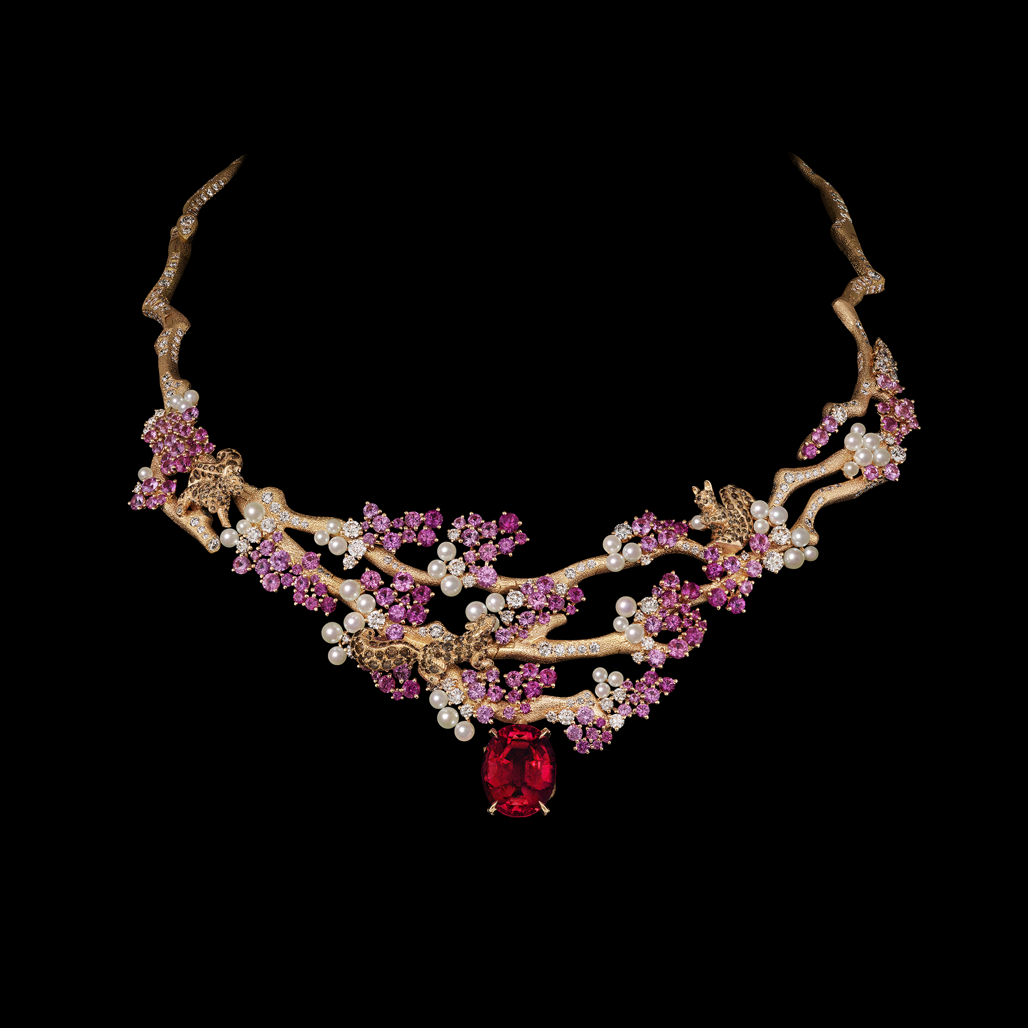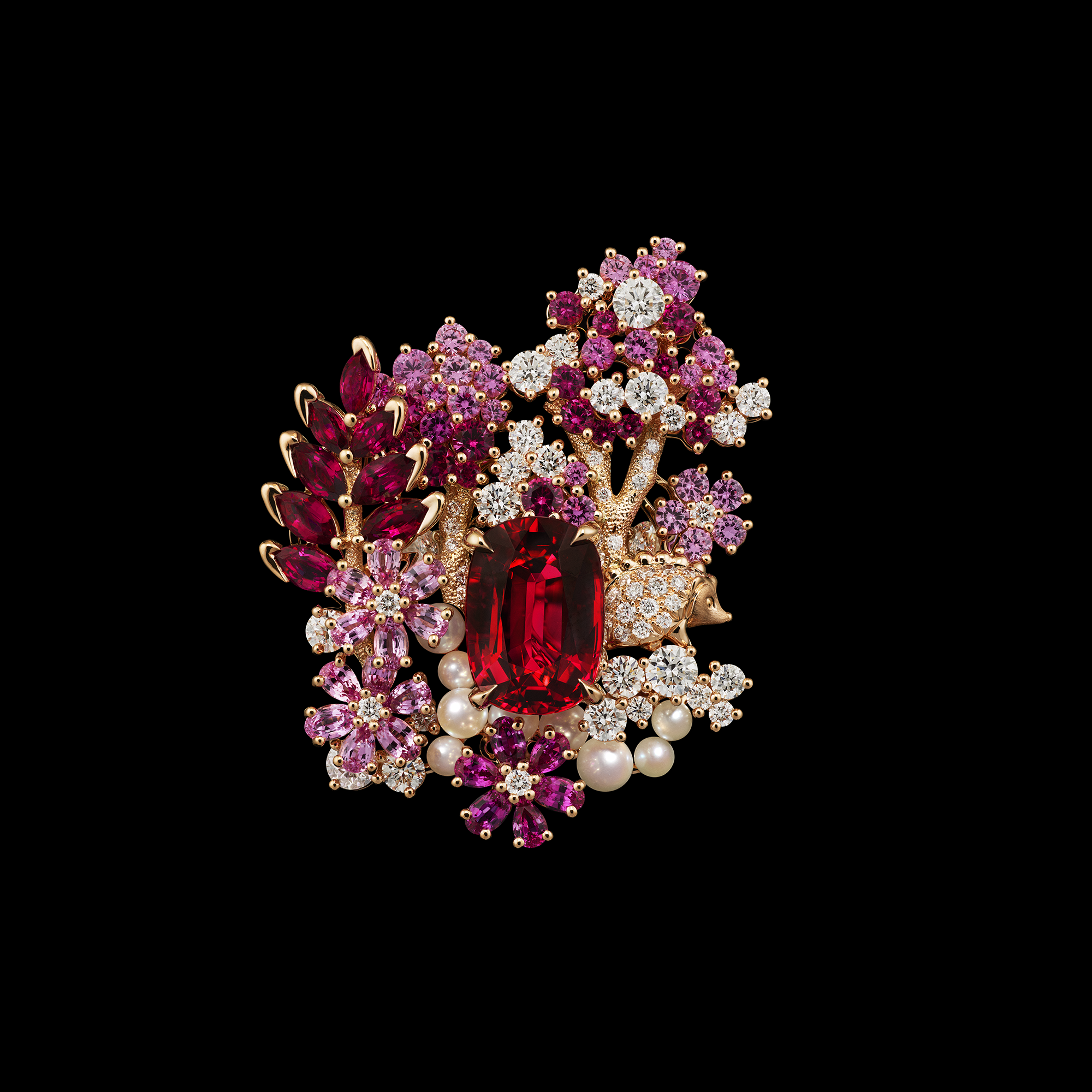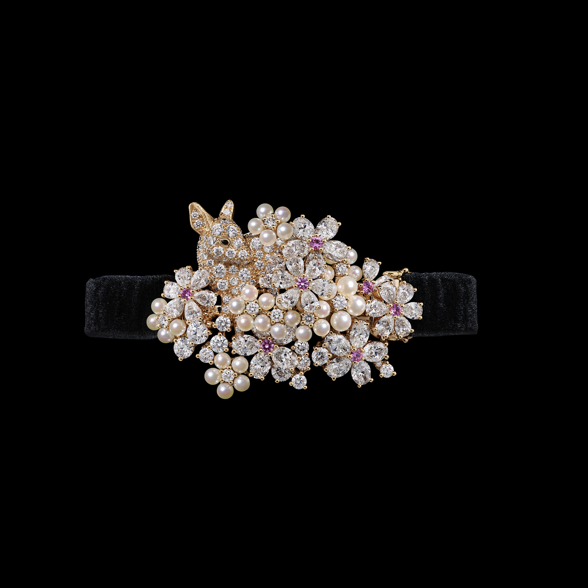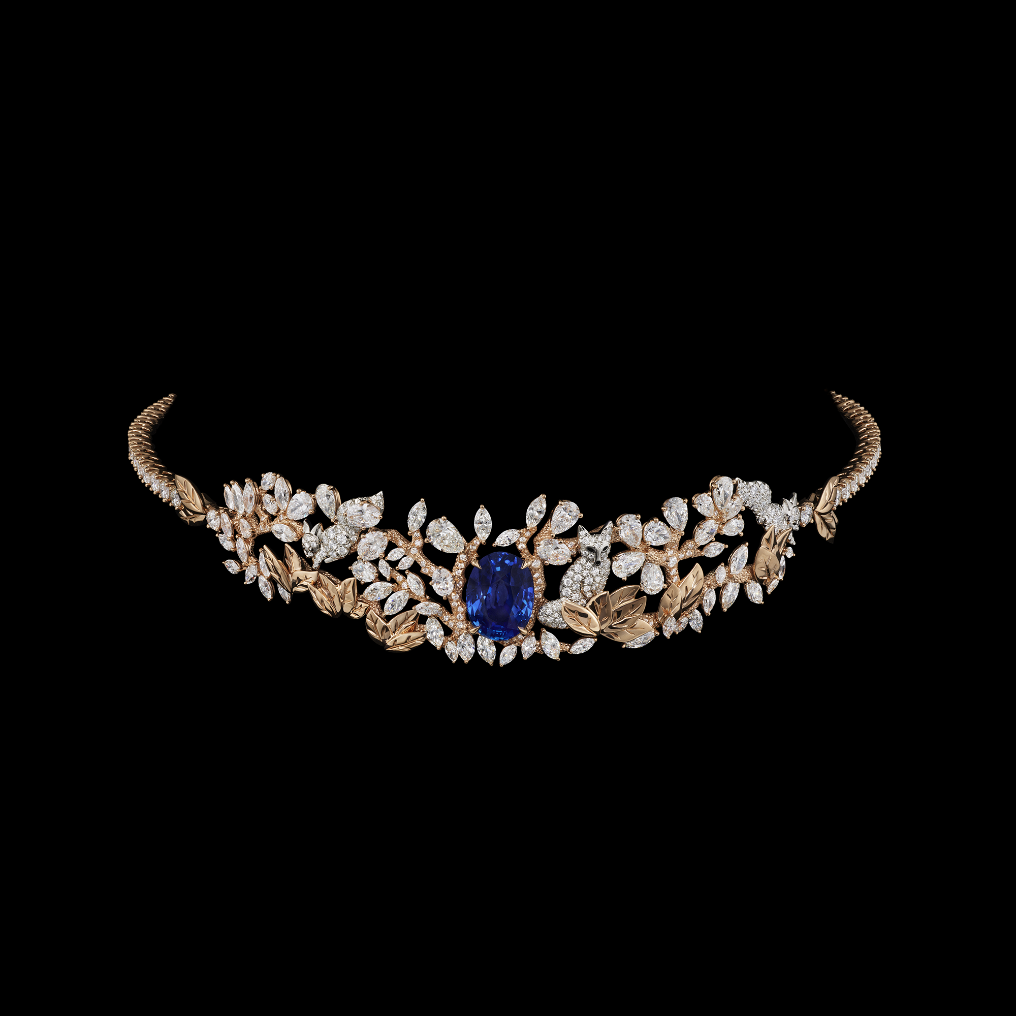 おとぎ話のようなイラストの世界を再解釈し、色調とボリューム感の組み合わせで美しさがより際立つ、小さくも最上級の フレスコ画のように、新作コレクションはミリー ラ フォレの庭園を軽やかに散策するよう誘います。それぞれのピースには 詩情豊かな動植物が印象的にあしらわれ、魅力的なデザインが目を引きます。ゴールドのウサギは、煌めくダイヤモンドが パヴェセッティングされた茂みに飛び込み、2羽のフクロウは、燃えるように赤いルビーに彩られた枝の間を羽ばたきます。堂々たる白鳥は、輝くブルーサファイアに縁取られた池の中心に姿を見せ、クチュールと自然を融合したデザインにはキツネ、リス、シカが登場し、そのすべては鮮やかなクリソプレーズで引き立てられています。さらにはイエローとピンクゴールドの葉が青々と茂るシュラブと優美な花びらを模したジュエリーが散りばめられた花壇が、ポエティックな演出を最高峰の輝きに溢れるジュエリーへと昇華させます。第2章「ディオリガミ」の幕開けを告げる、繁茂する緑の草木を豊かに表現したネックレス、リング、イヤリングが、壮麗なコレクションの豪華絢爛なフィナーレを飾ります。