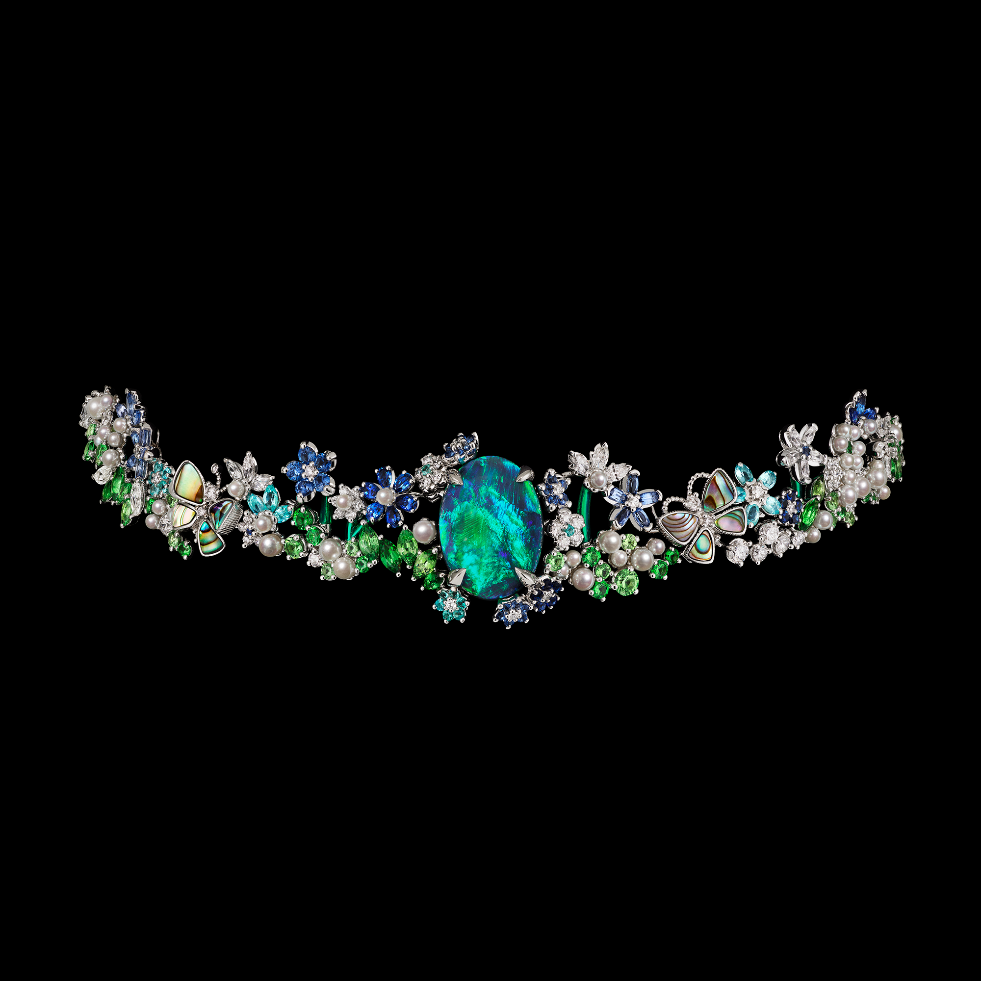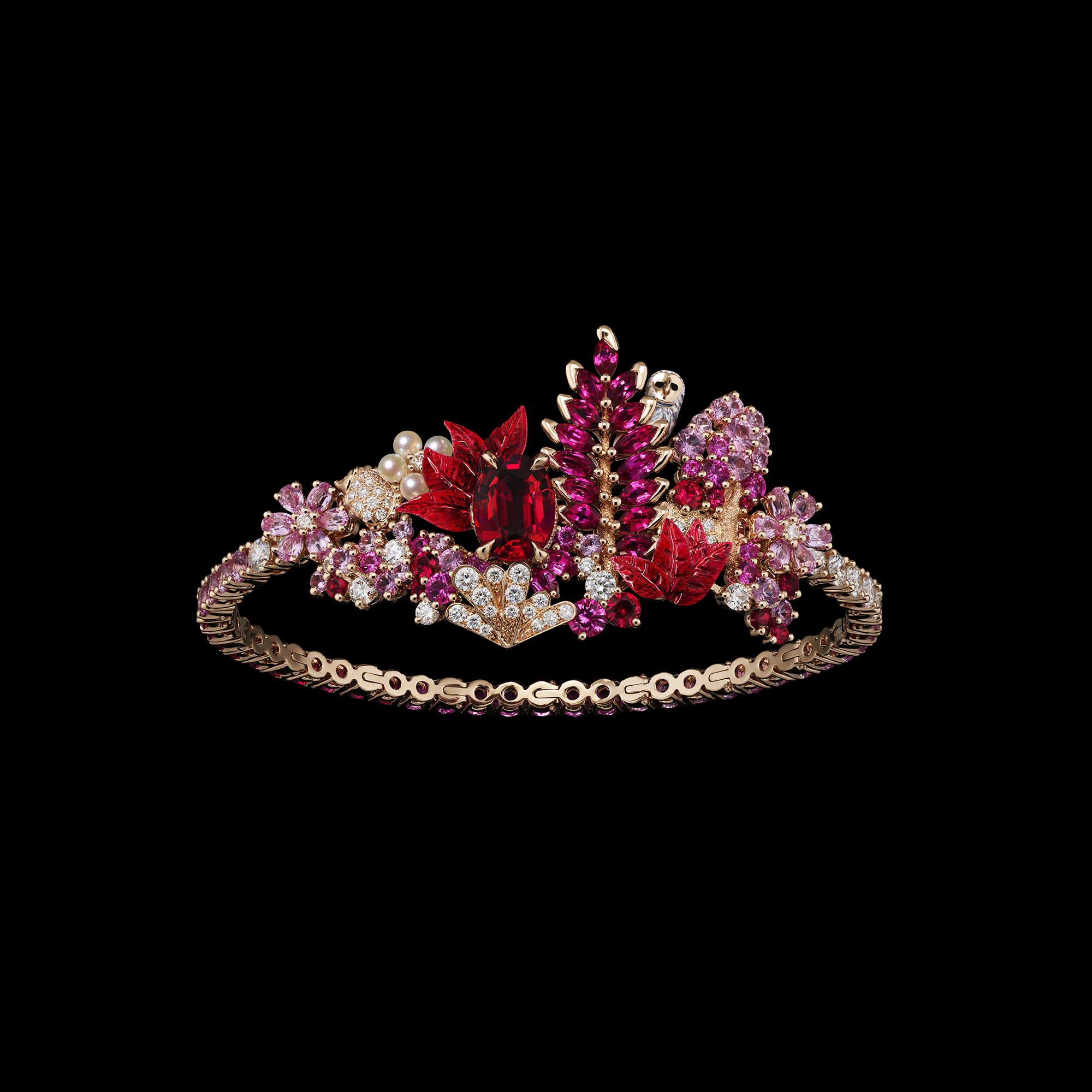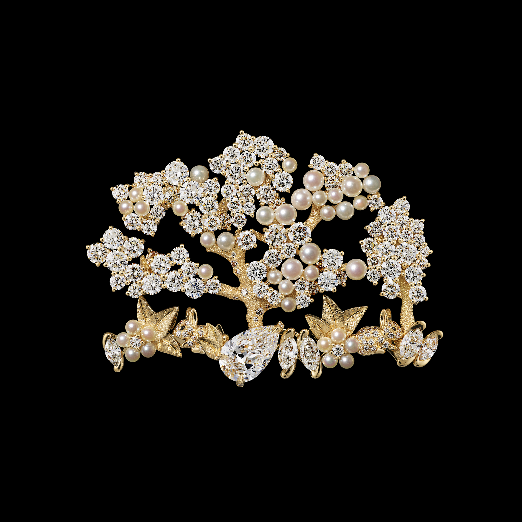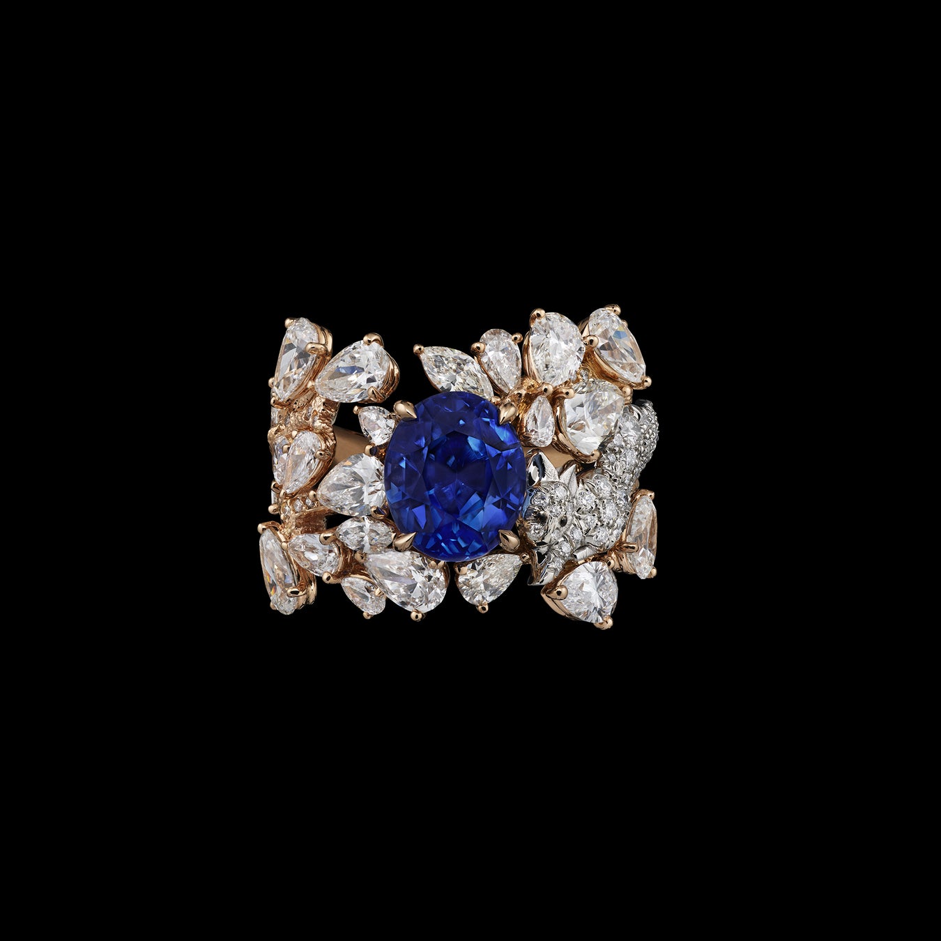おとぎ話のようなイラストの世界を再解釈し、色調とボリューム感の組み合わせで美しさがより際立つ、小さくも最上級の フレスコ画のように、新作コレクションはミリー ラ フォレの庭園を軽やかに散策するよう誘います。それぞれのピースには 詩情豊かな動植物が印象的にあしらわれ、魅力的なデザインが目を引きます。ゴールドのウサギは、煌めくダイヤモンドが パヴェセッティングされた茂みに飛び込み、2羽のフクロウは、燃えるように赤いルビーに彩られた枝の間を羽ばたきます。堂々たる白鳥は、輝くブルーサファイアに縁取られた池の中心に姿を見せ、クチュールと自然を融合したデザインにはキツネ、リス、シカが登場し、そのすべては鮮やかなクリソプレーズで引き立てられています。さらにはイエローとピンクゴールドの葉が青々と茂るシュラブと優美な花びらを模したジュエリーが散りばめられた花壇が、ポエティックな演出を最高峰の輝きに溢れるジュエリーへと昇華させます。第2章「ディオリガミ」の幕開けを告げる、繁茂する緑の草木を豊かに表現したネックレス、リング、イヤリングが、壮麗なコレクションの豪華絢爛なフィナーレを飾ります。