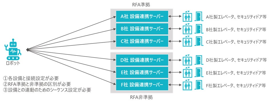「RoboticBase」とエレべータやセキュリティドア・ゲート、電子錠等の各設備との連携は、RFA※1に準拠したインターフェースによってその品質が保証されています。また、RFAに準拠していない設備とも「RoboticBase」を介して接続が可能です。