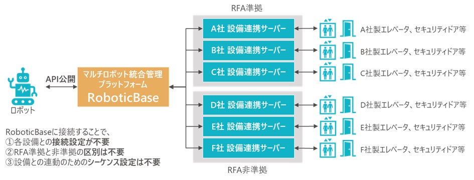 RFAに準拠しているサービスプラットフォームであれば、ロボットとの相互接続が容易になります。「RoboticBase」は、各サービスプラットフォームの連携ハブとしても機能します。これにより各ロボットメーカは、従来個々の接続に必要だった時間とコストを削減でき、より容易に導入が可能になります。