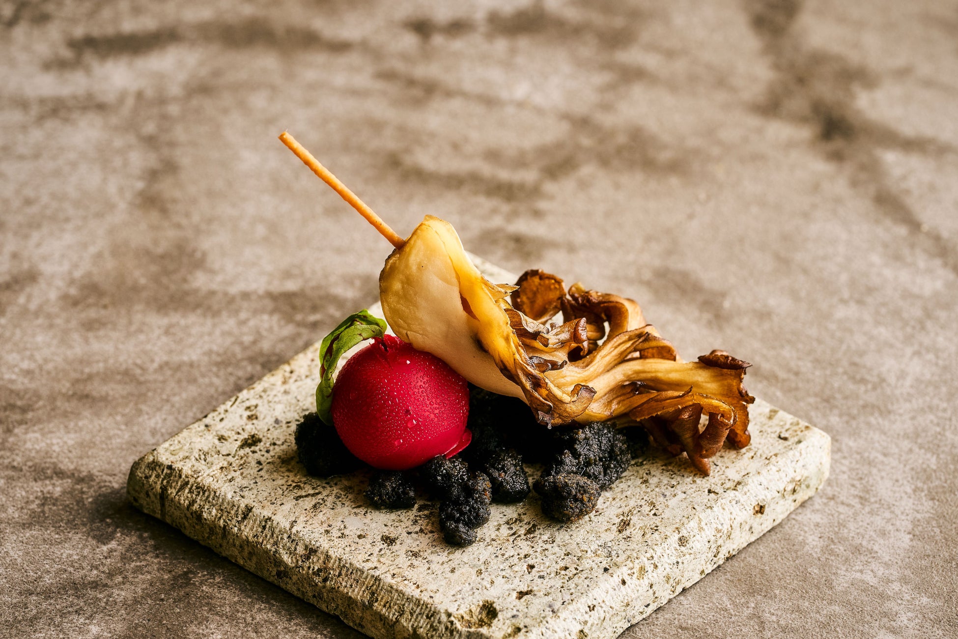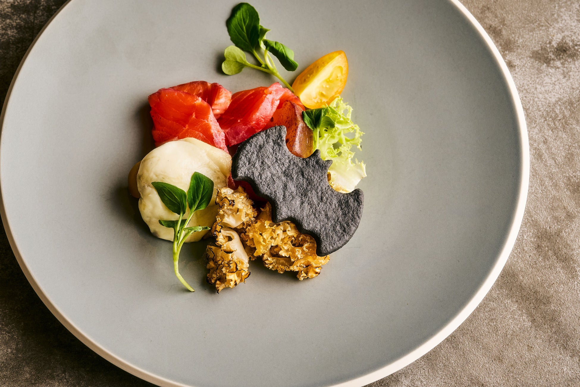 Appetizer:柿とサーモンのシャンパンマリネ カプレーゼ風 ハナビラタケ 薪焼モッツアレラ 蝙蝠ビスケット