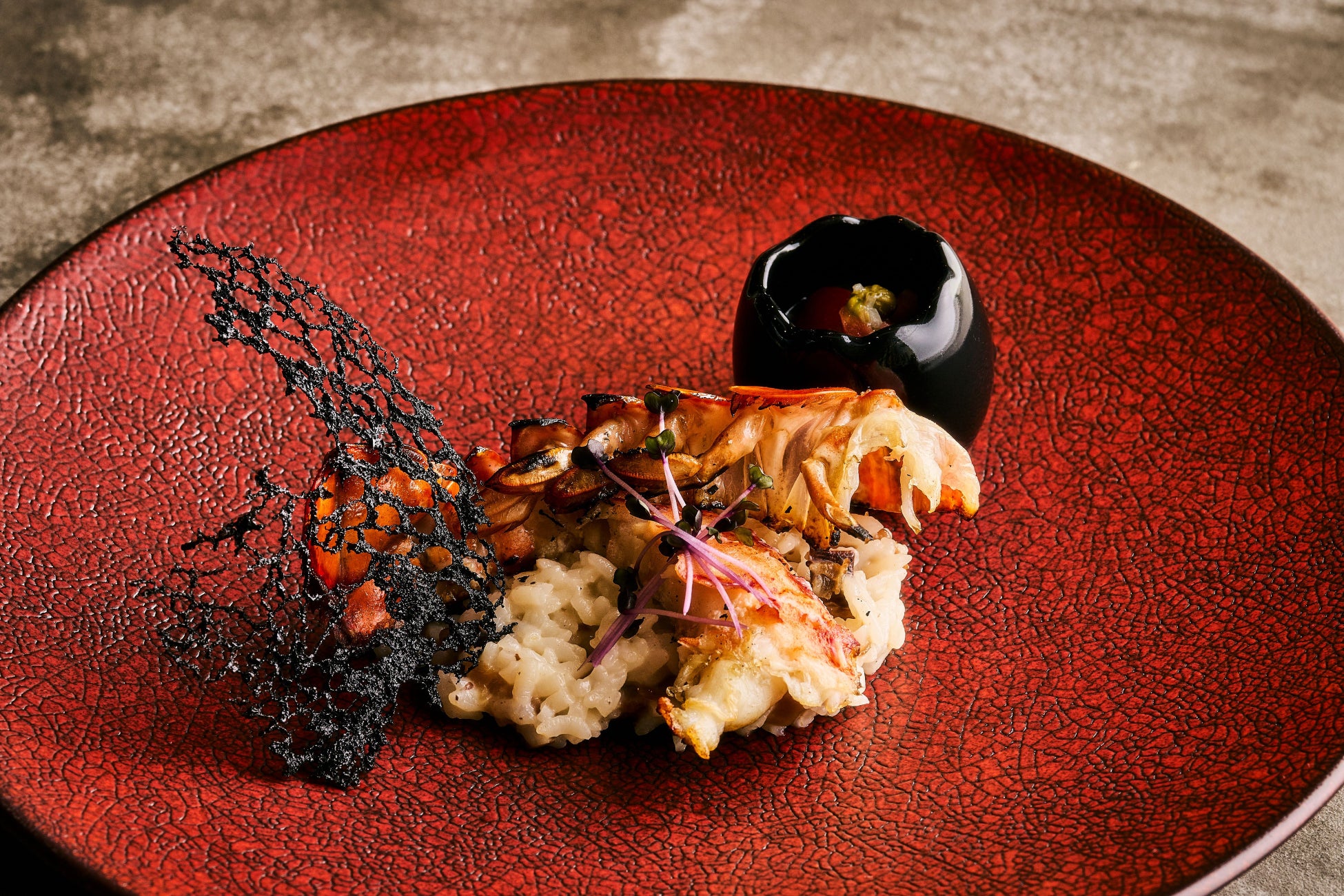 Fish:オマール海老の薪焼き 生ハムと甘栗のリゾット パプリカ風味の蜘蛛の巣