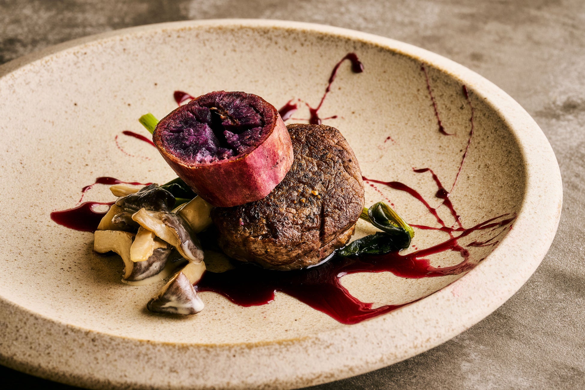 Meat:国産牛フィレ肉 金時草のソテー 紫芋 クリームまみれの茸たち 椎茸 エリンギ茸 トランペット茸 モリーユ茸