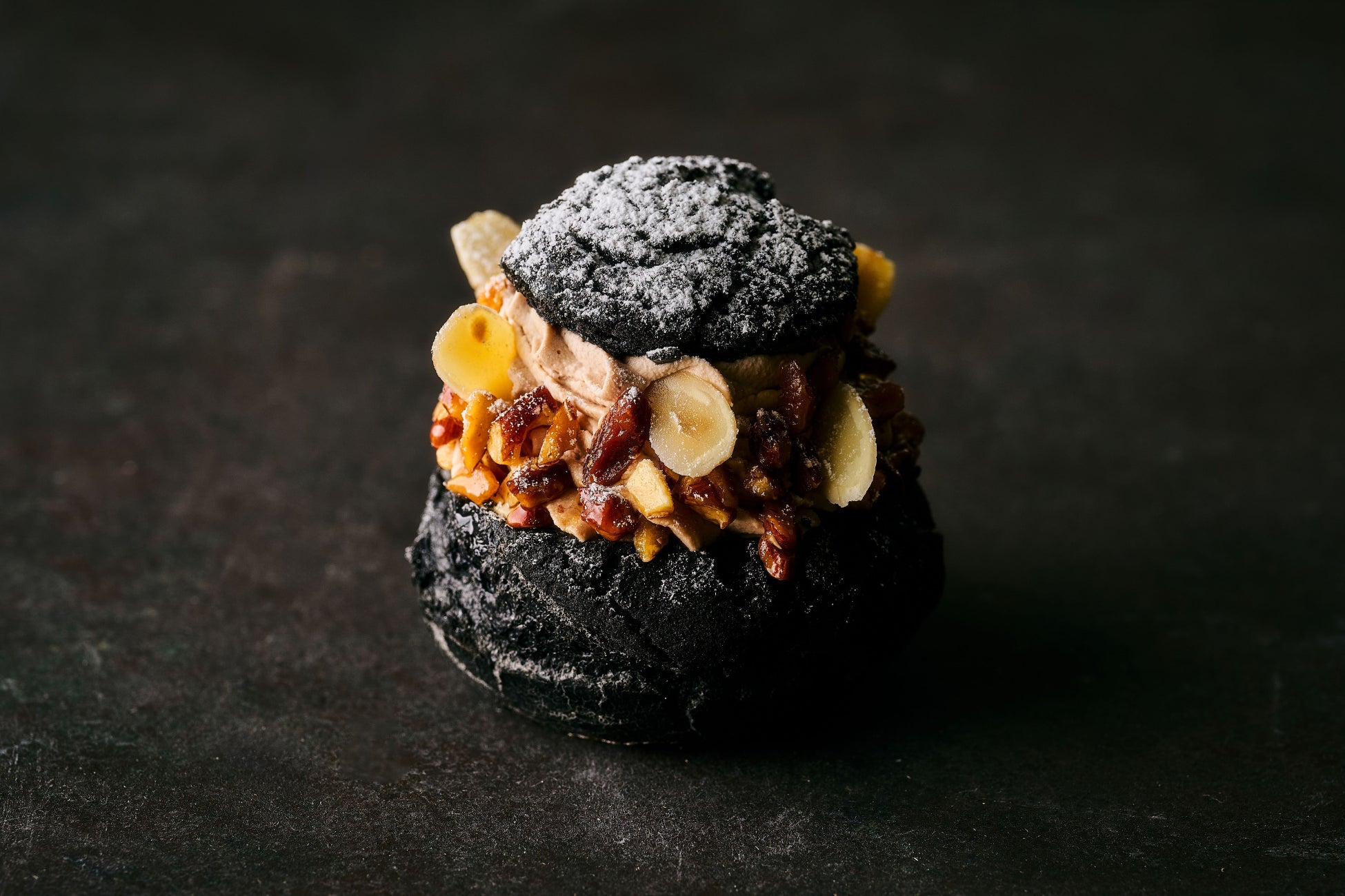 竹炭とブラックココアのシュー生地に、キャラメルを練り込んだカスタードクリームを流し、チョコレートのシャンティクリームで仕上げた一品です。