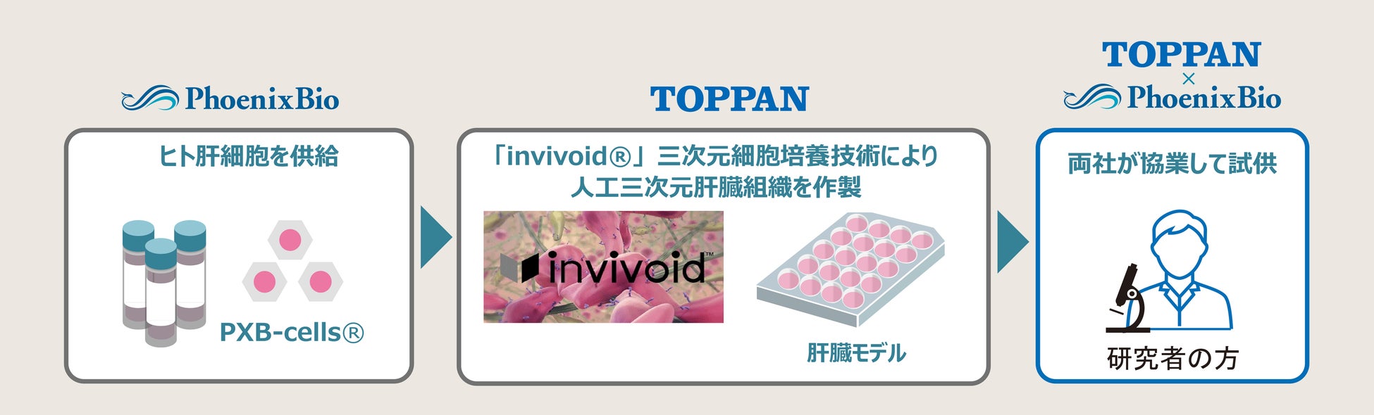 TOPPANホールディングスは、これまでに3D細胞培養技術「invivoid®」を大阪大学大学院工学研究科 松﨑典弥教授と共同で開発しており、がん個別化医療、創薬研究、培養肉などに向けた研究を進めています。本業務提携により、TOPPANホールディングスの「invivoid®」とフェニックスバイオの新鮮ヒト肝細胞「PXB-cells®」を組み合わせた「人工三次元肝臓組織」(以下 肝臓モデル)について共同での試供を開始します。