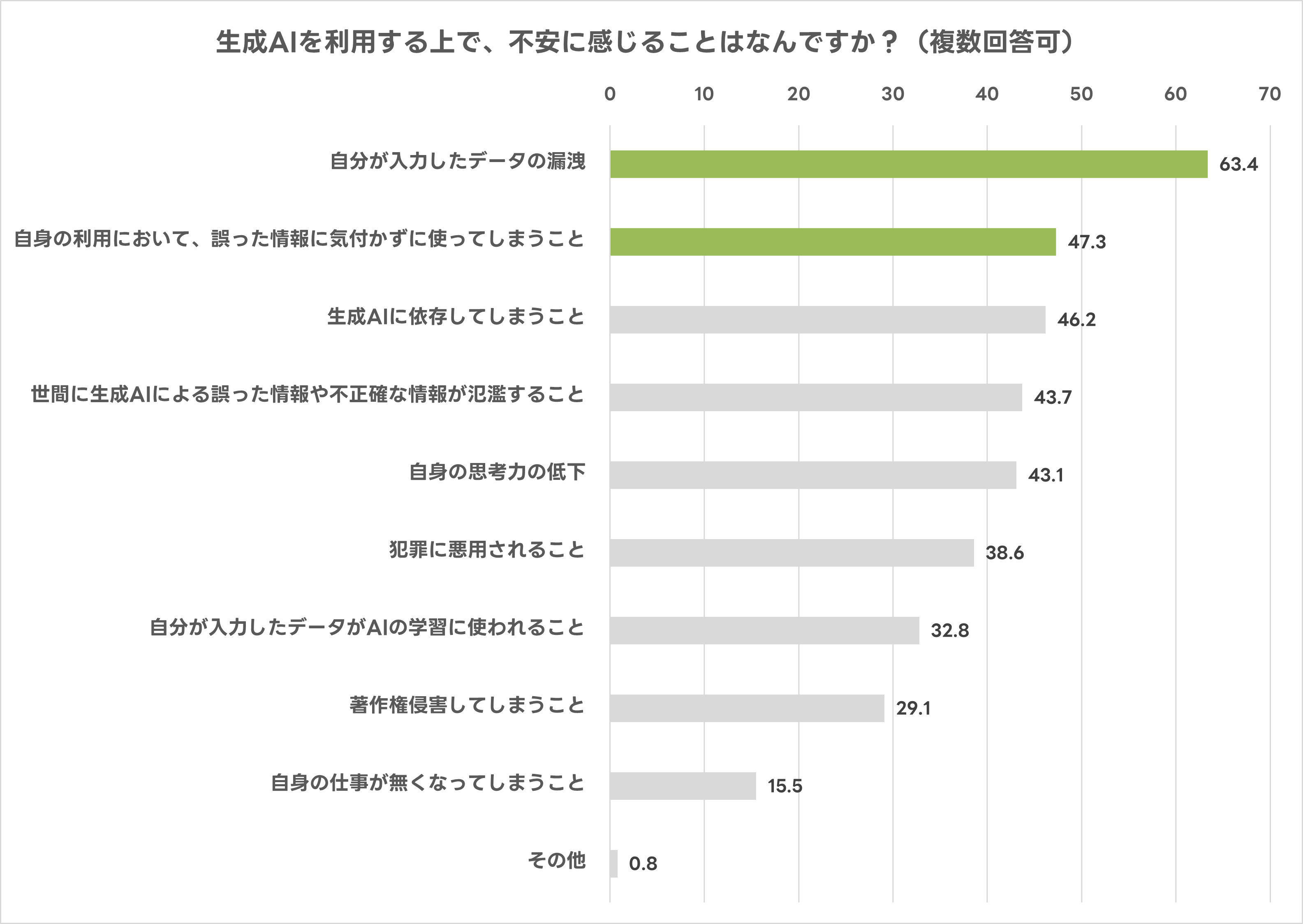 生成AIを利用する上で具体的な不安要素として、「自分が入力したデータの漏洩(63.4%)」が最多となり、情報の取り扱いに対する不安が顕著に現れる結果となりました。次いで「自身の利用において、誤った情報に気づかずに使ってしまうこと(47.3%)」や「生成AIへの依存(46.2%)」が挙げられました。