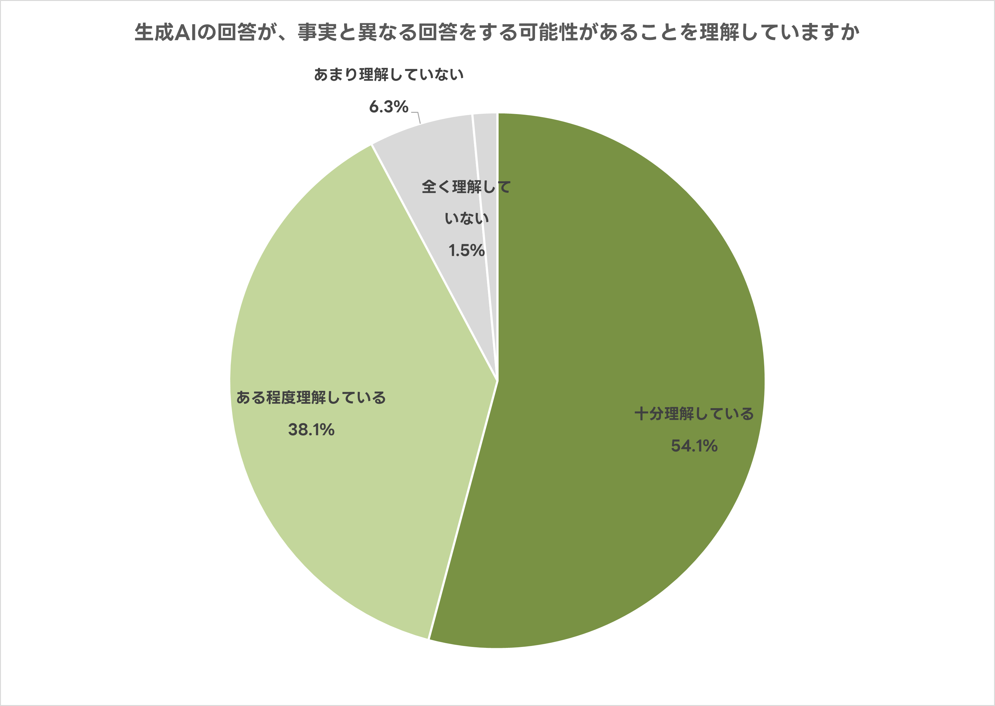 生成AIが事実と異なる回答をする可能性について、「十分理解している」または「ある程度理解している」と回答した人は92.3%でした。生成AIによる誤回答のリスクは、利用者の間で高いレベルで認知されています。