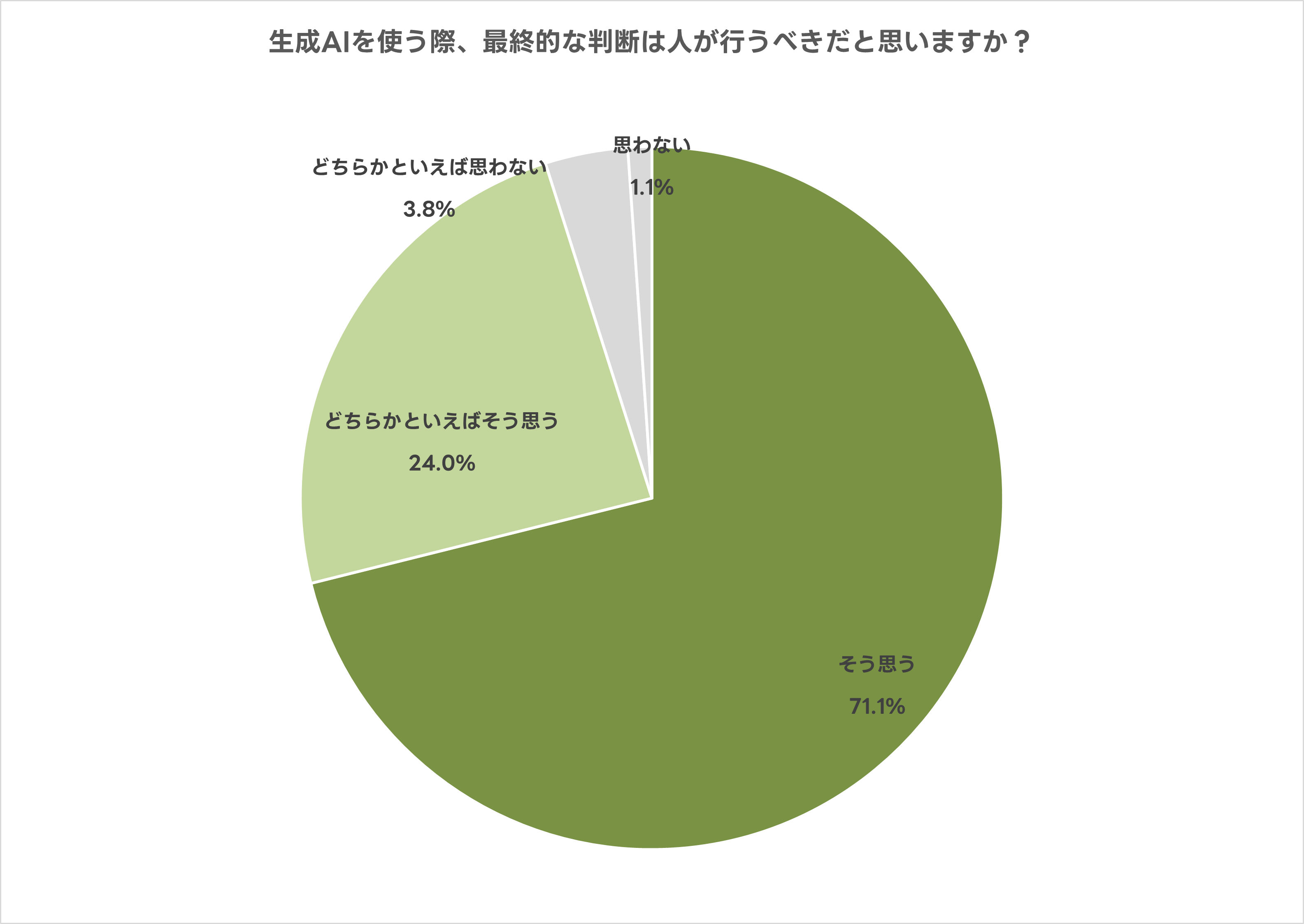 生成AIを使う際、最終的な判断は人が行うべきかという問いに、「そう思う」または「どちらかといえばそう思う」と答えた人は95.1%に上りました。生成AIに依存しすぎず、自らが責任を持つという高い規範意識が浮き彫りになっています。