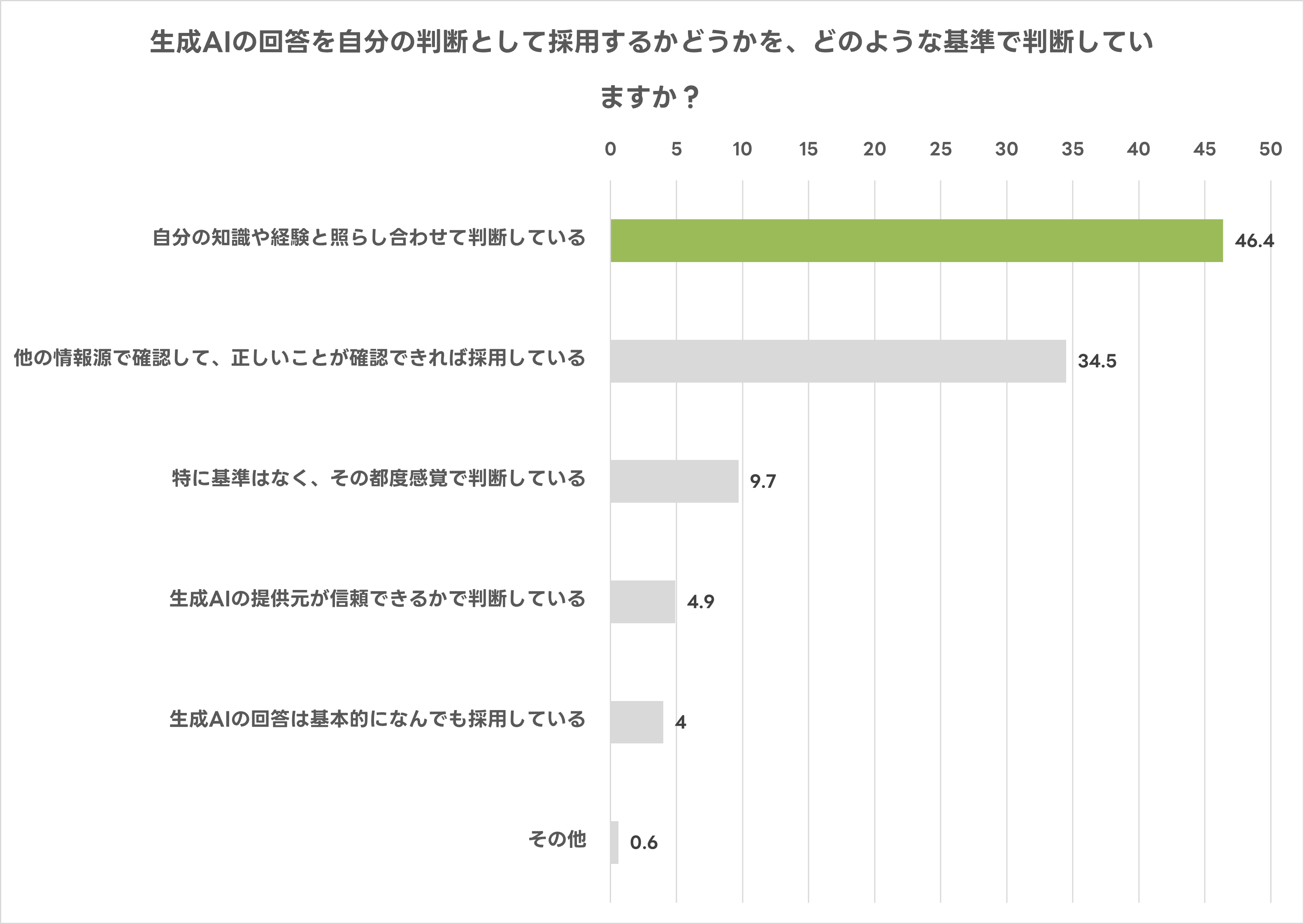 生成AIの回答を採用する基準は「自分の知識や経験と照らし合わせて判断」が46.4%と最も多く、個人の知識と経験に委ねた判断で採用している人が多い結果となりました。一方で、「他の情報源での確認」により採用する人は34.5%でした。