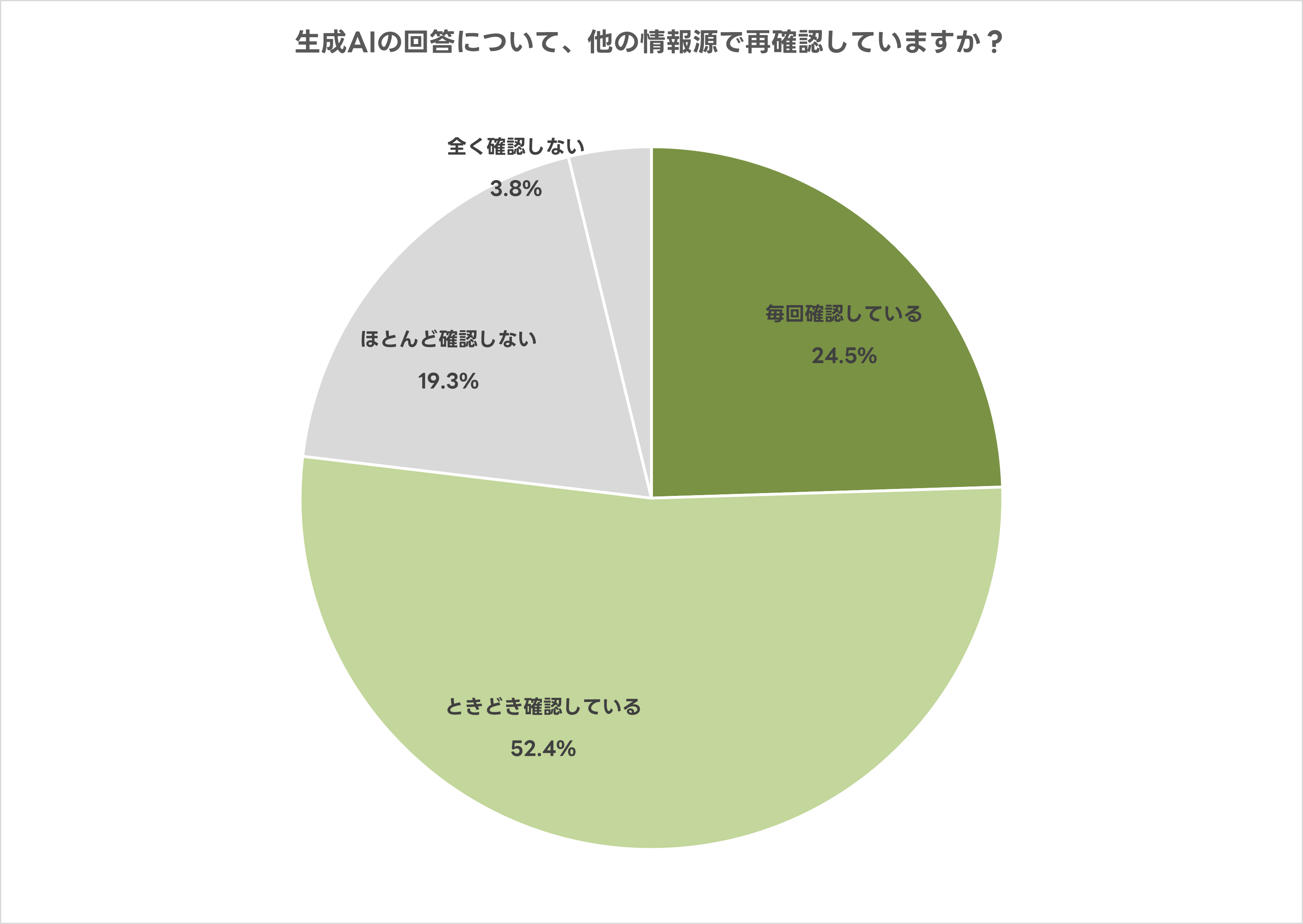 生成AIの回答を他の情報源で再確認するかという問いに対し、「毎回確認している」または「ときどき確認している」人は76.9%と高い水準でした。