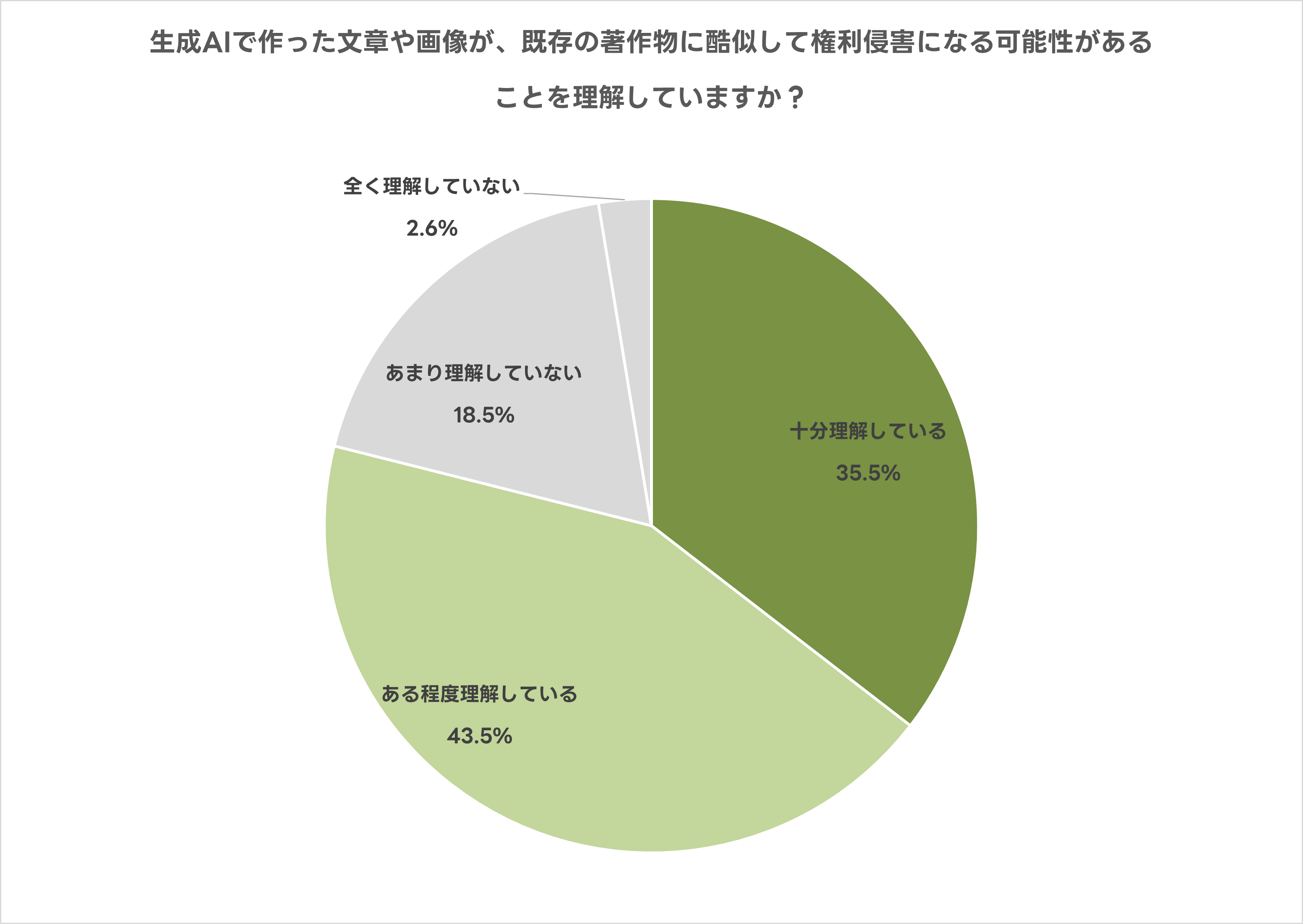 生成AIが作った文章や画像が、既存の著作物に酷似して権利侵害になる可能性について、「十分理解している」または「ある程度理解している」人は79.0%と高い水準で理解が進んでいる結果となりました。