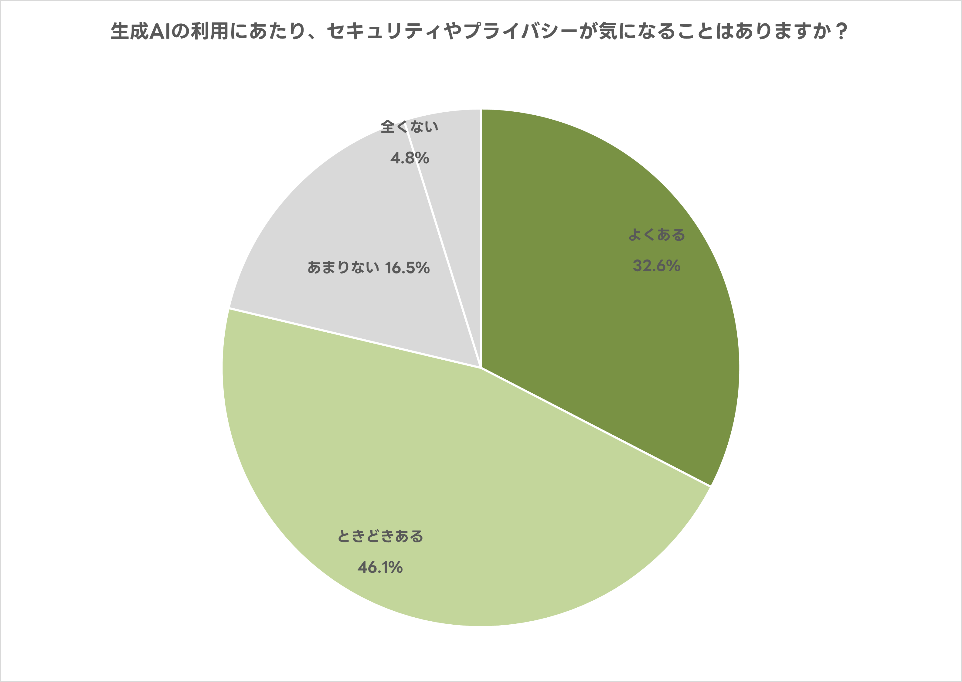 生成AIを利用する際、セキュリティやプライバシーが気になることが、「よくある」または「ときどきある」と回答した人は78.7%となり、多くのユーザーが生成AIに不安を感じながら利用している現状が伺えます。