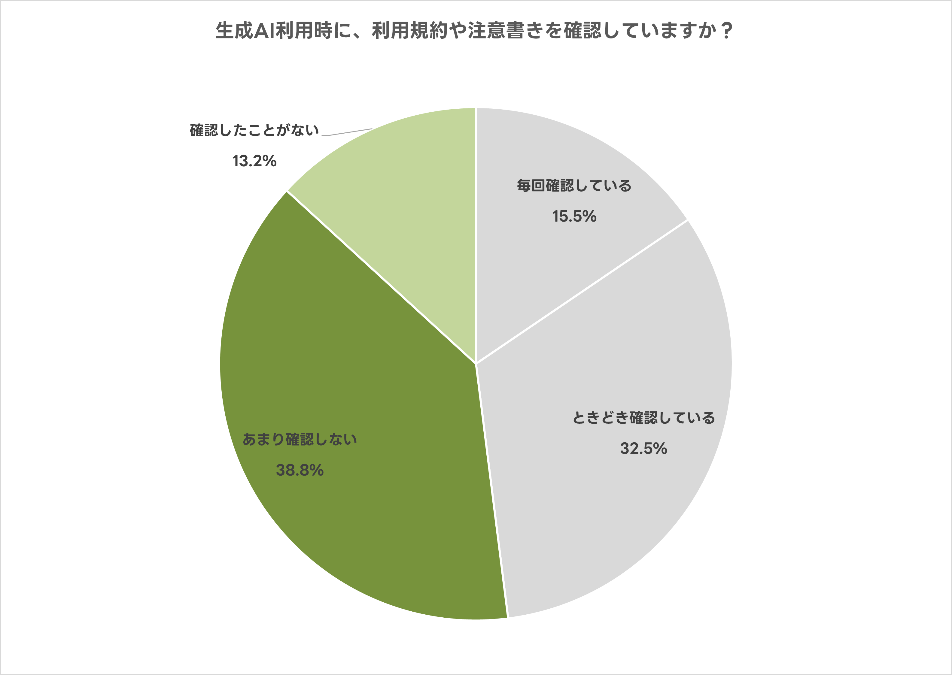 生成AI利用時に、規約や注意書きを「あまり確認しない」または「確認したことがない」と答えた人は52.0%となりました。セキュリティやプライバシーへの不安は多くの人が感じている一方で、利用規約の確認など具体的な行動の間にはギャップがあることが分かりました。