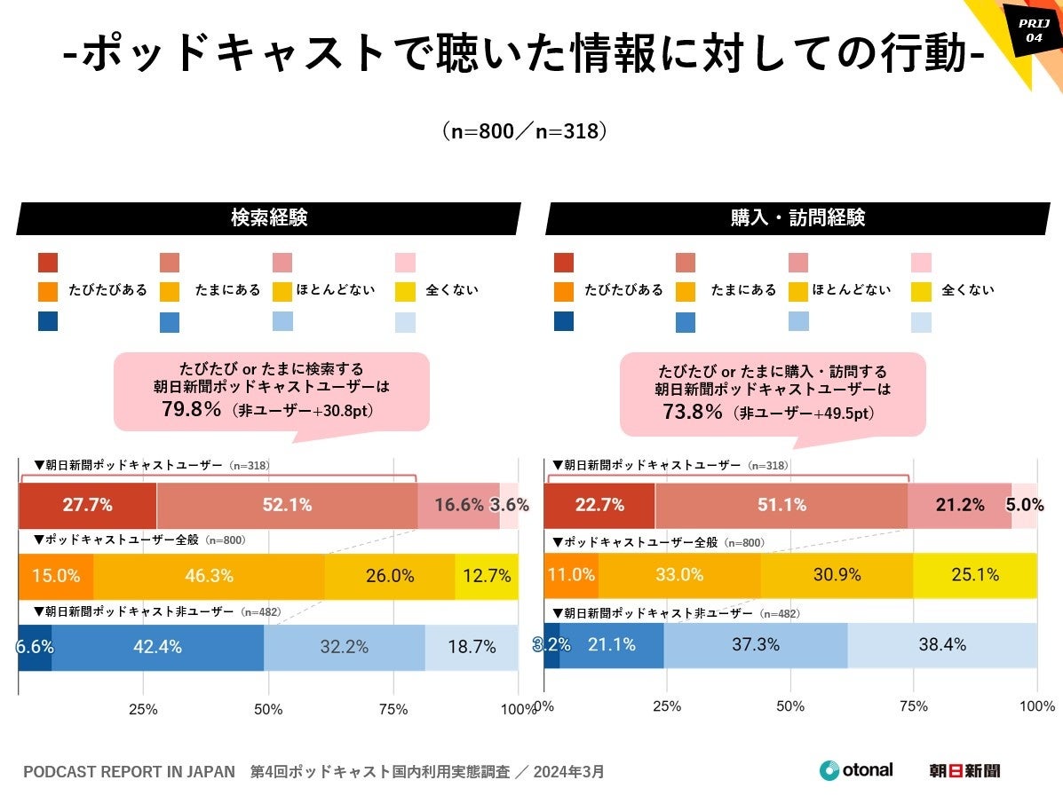 ポッドキャストを聴いた後の行動については、朝日新聞ポッドキャストユーザーの8割近くが、ポッドキャストで聴いた商品や場所などについて一定の頻度で検索していると回答しました。さらに7割以上が一定の頻度で購入したり、訪問したりした経験があることもわかりました。