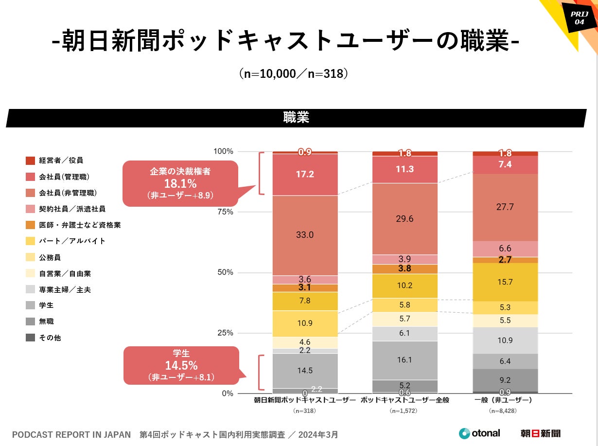 朝日新聞ポッドキャストユーザーは、非ユーザーと比較して、企業の決裁権者や学生が多いことがわかりました。経営者、役員、管理職を合わせた企業の決裁権者は、非ユーザーが9.2%に対し、朝日新聞ポッドキャストユーザーでは、18.1%でした。学生の比率も、非ユーザーが6.4%に対し、朝日新聞ポッドキャストユーザーは14.5%で、多い傾向がみられました。