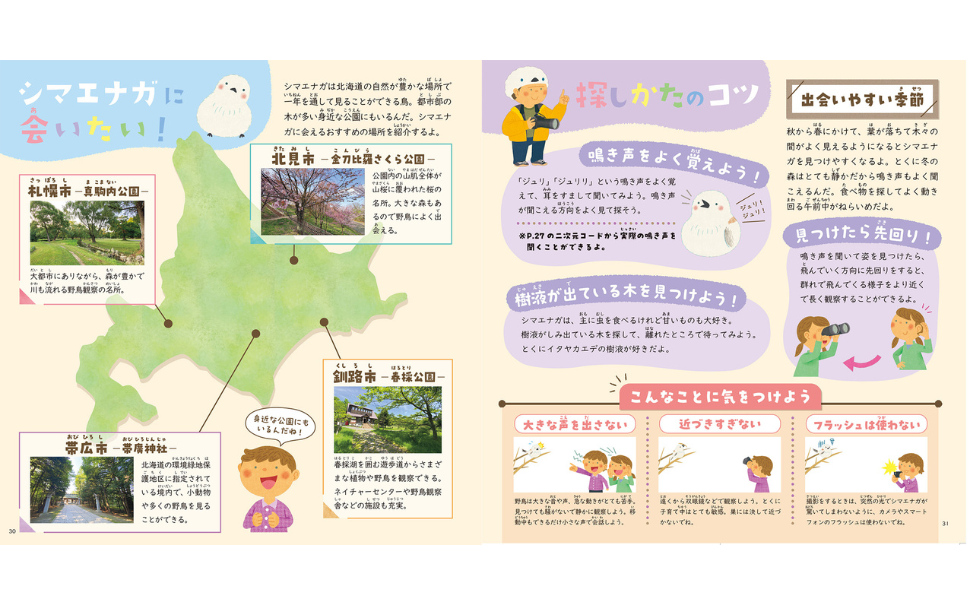 本の最後では、シマエナガの体の特徴や羽のしくみ、スゴいところ、おすすめ観察スポット等、詳しく解説・紹介しています。二次元コード付きで、貴重な鳴き声の音声や、巣づくり・子育ての様子などの動画も見られます。