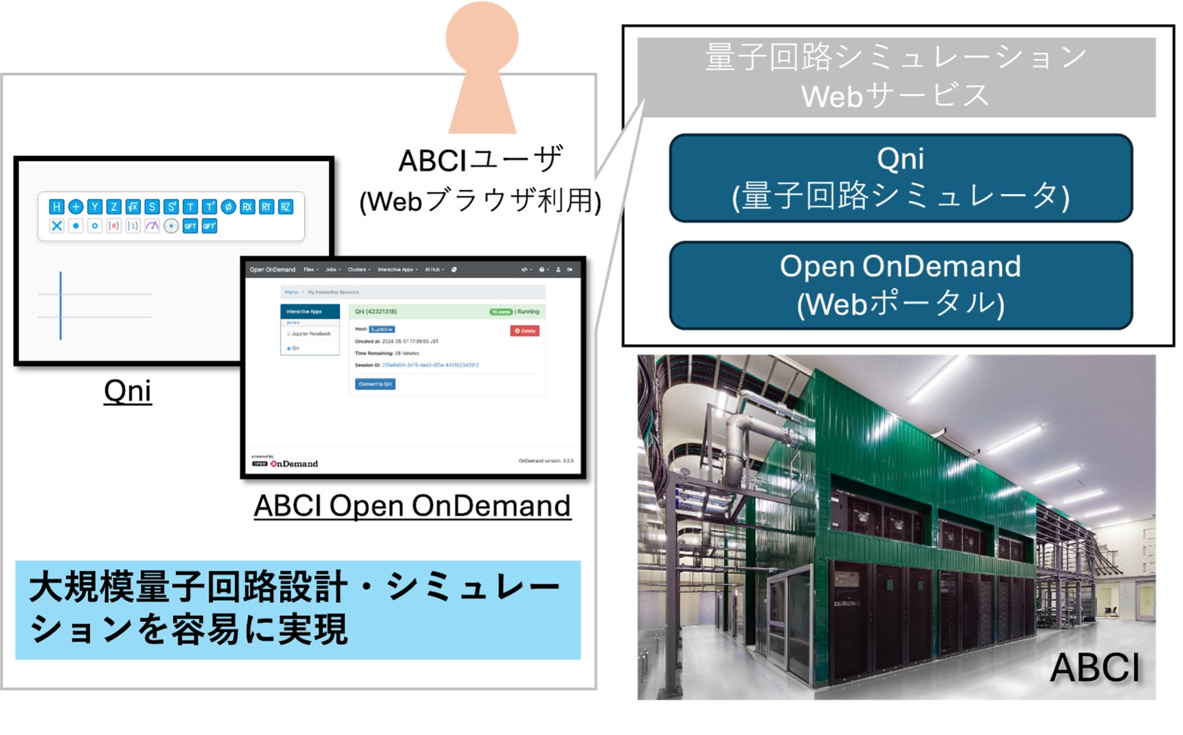 そこで、今回スパコン使用の垣根を下げることと、人工知能研究だけでなく、新たに量子技術の研究開発にも活用すべく、スパコン向けアプリケーションを Web ブラウザ経由で実行するためのフレームワークである Open OnDemand※3 に着目しABCI に導入しました。そして、ABCI における初の量子コンピューティングへの取り組みとして「Qni」を Open OnDemand に対応させることで、今回のサービス提供に至りました。