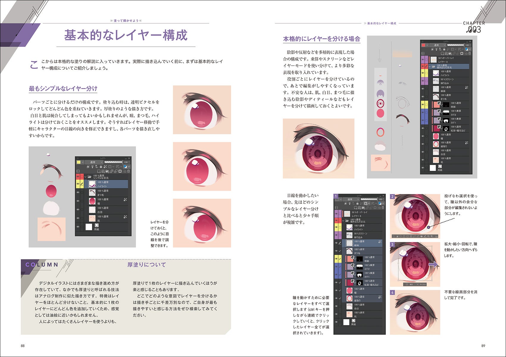 CHAPTER 3:塗って輝かせよう(・基本的なレイヤー構成・ブラシの使い分け・基本的な塗りの手順・瞳の色とグラデーション・瞳孔・虹彩の描き方とアレンジ・まつ毛の魅力的な描き方・瞳の色の決め方