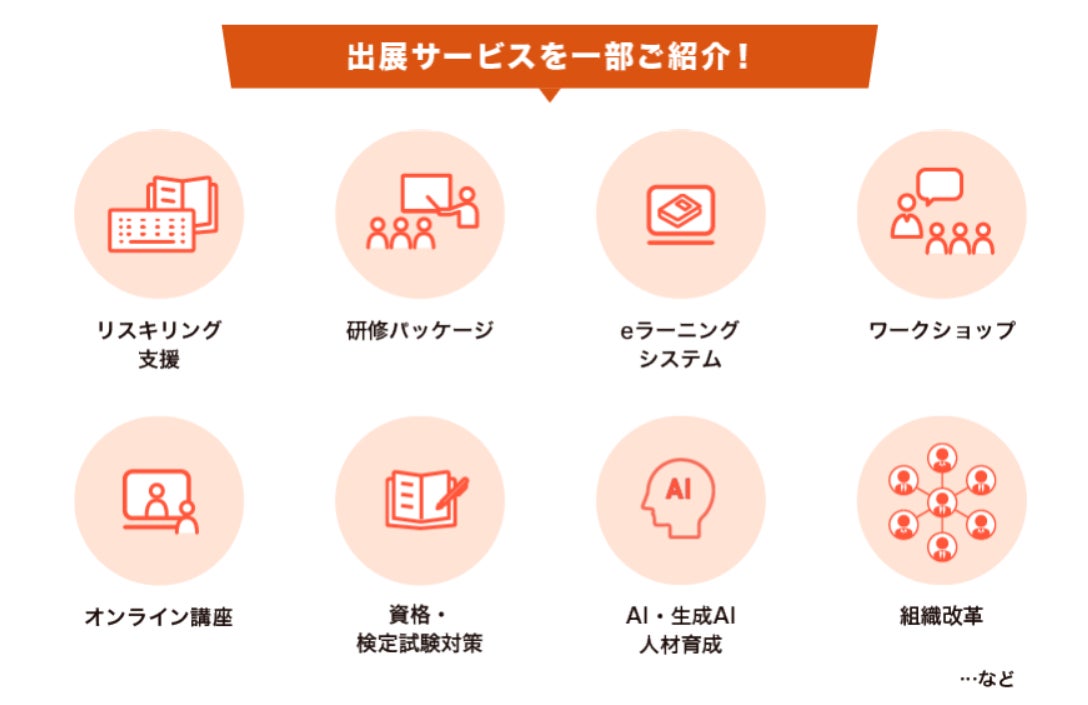 本エリアでは、デジタル人材育成の導入に向けて、全社的なDX推進や、人事制度の再設計など、組織の改革をサポートするサービスが出展します。