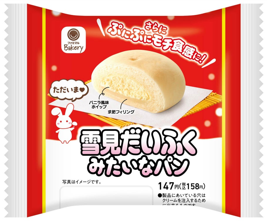 【内容】前回発売時よりもさらにぷにぷにモチ食感になった「雪見だいふく」みたいなパンです。パン生地には生クリームを使用し、求肥を包んで焼くことで、やわらかく弾力のあるぷにぷにモチ食感を再現しました。さらに、バニラ風味のミルククリームを注入することで、「雪見だいふく」のバニラアイスのような味わいをお楽しみいただける仕立てです。