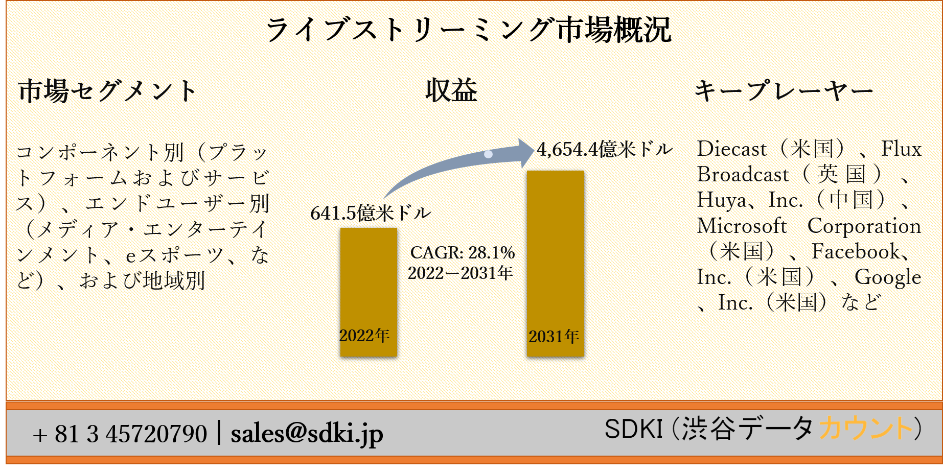 SDKI Inc.は、「世界のライブストリーミング市場ー予測2022ー2031年」新レポートを 2021年12月31日に発刊しました。この調査には、ライブストリーミング市場の成長に必要な統計的および分析的アプローチが含まれています。レポートで提供される主要な産業の洞察は、市場の既存のシナリオに関する読者に市場の概要についてのより良いアイデアを提供します。さらに、レポートには、市場の成長に関連する現在および将来の市場動向に関する詳細な議論が含まれています。
